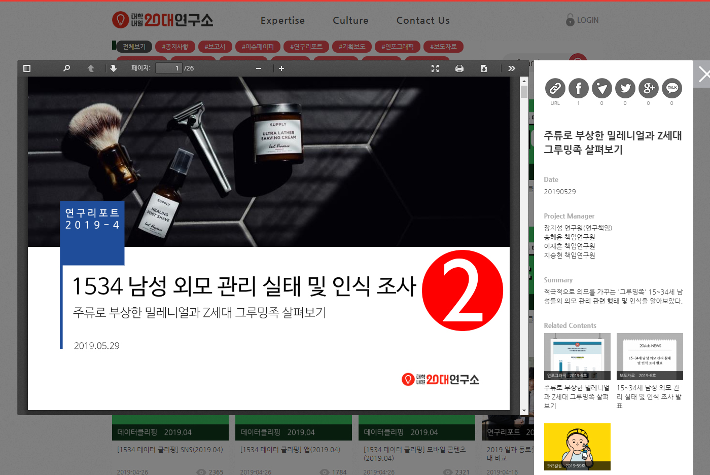 상단의 태그를 통해 자료유형별로 정보를 확인할 수 있어요. 저는 1번의 '주류로 부상한 밀레니얼과 Z세대 그루밍족 살펴보기'를 눌러봤습니다.