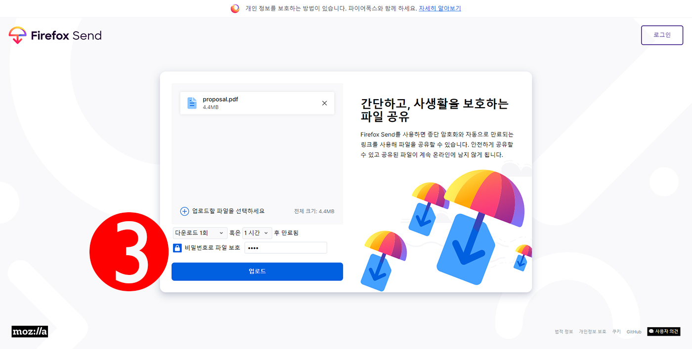 3번에서 비밀번호로 파일 보호를 체크하고 비밀번호를 입력해줍니다. 연인끼리/혹은 뒤가 구린 사람들끼리 많이 이용할 것 같아요. 업로드 버튼을 눌러봅니다.