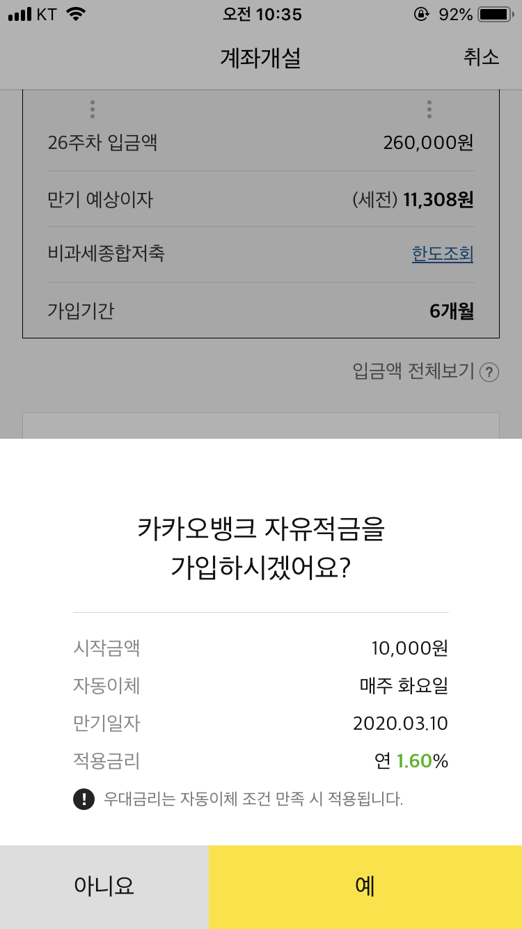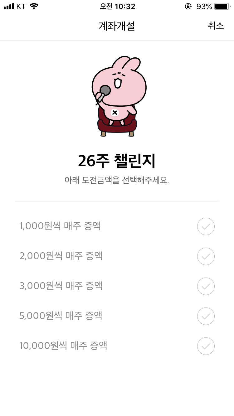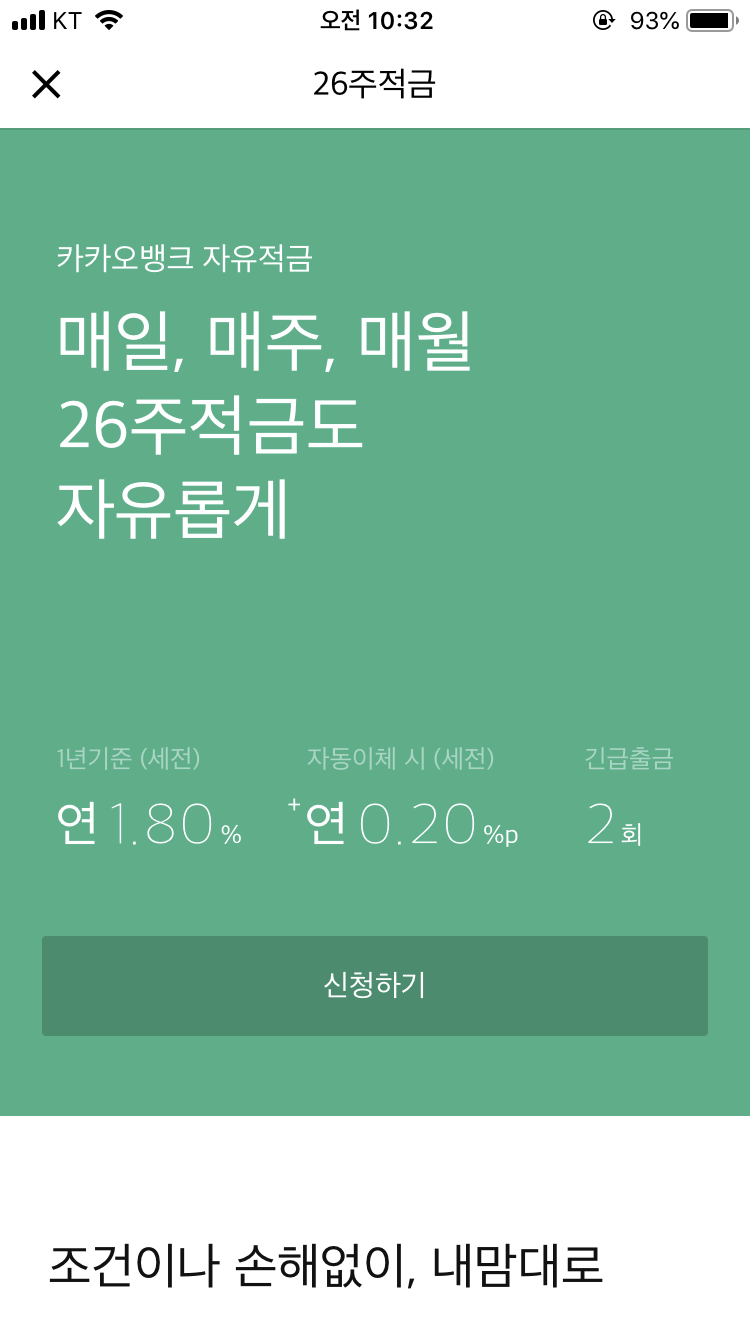 카카오뱅크 체크카드 신청을 하다가 26주 적금 상품이 있는 걸 보고는 얼른 가입했다. 첫주 1만원으로 시작하면 2주차에는 2만원을 넣게 되는 시스템으로 마치 게임처럼 만들어놓은 게 신기했다. 요즘 돈 모으는 재미에 푹 빠져서 이 기회를 놓칠 수 없다고 생각했다.