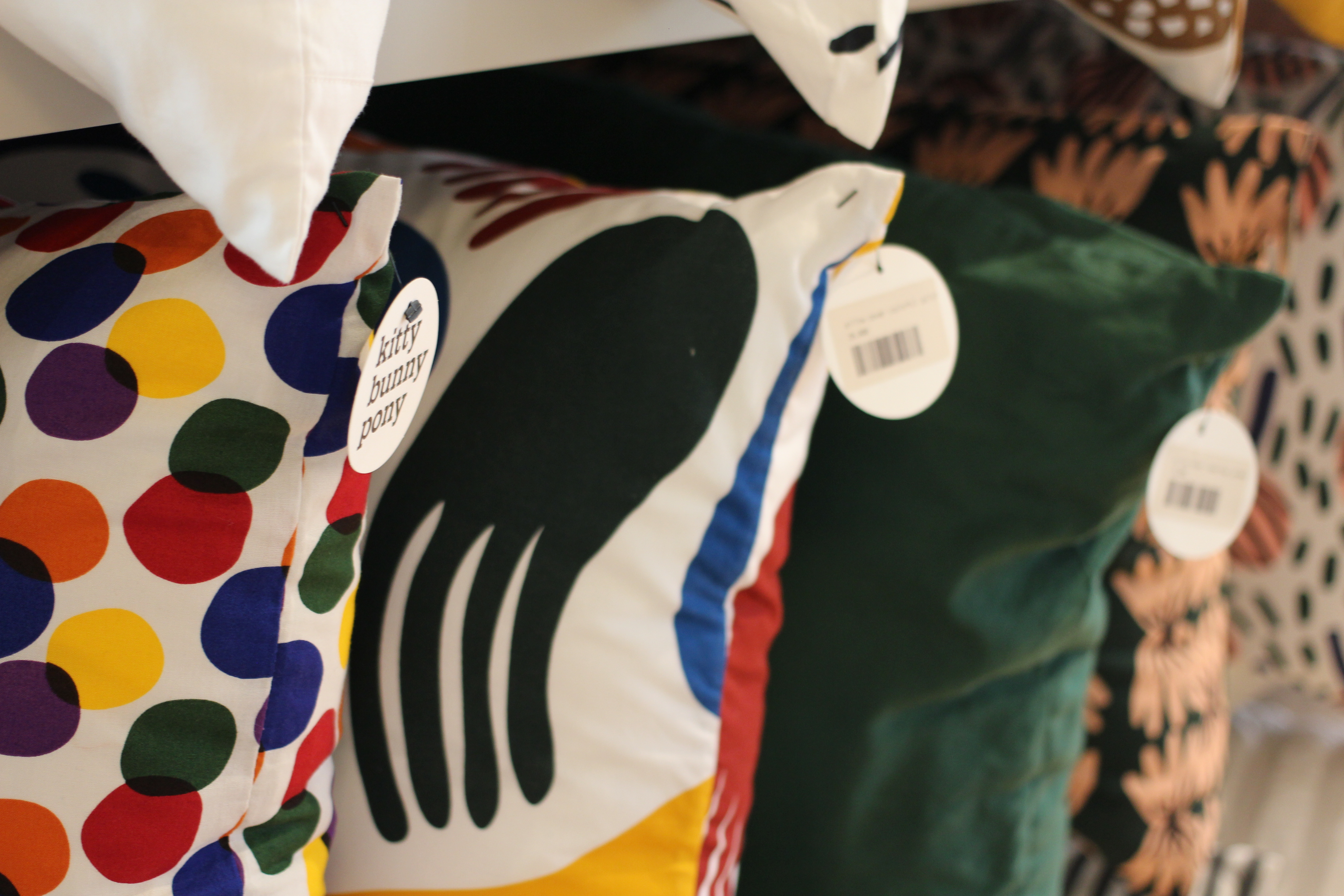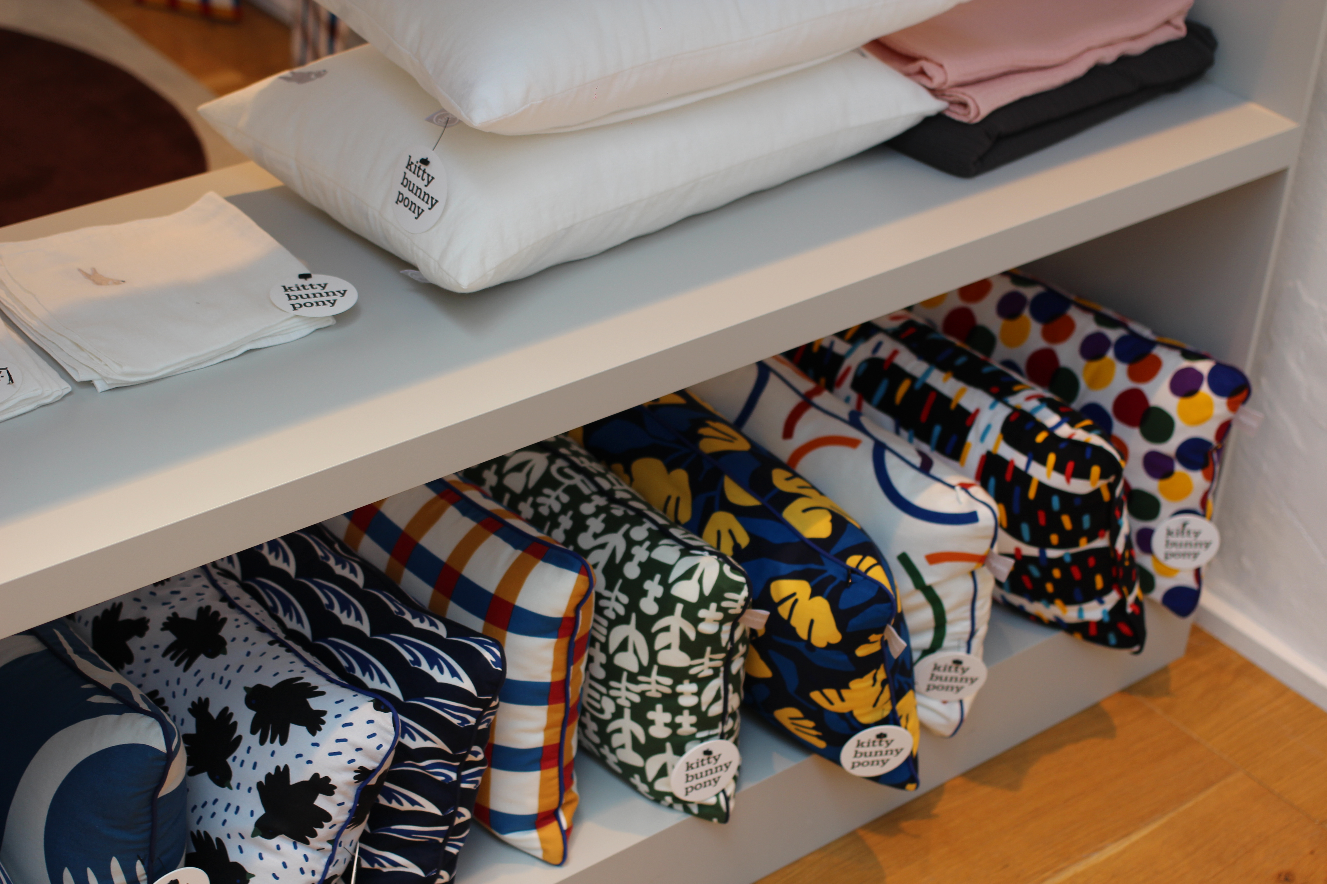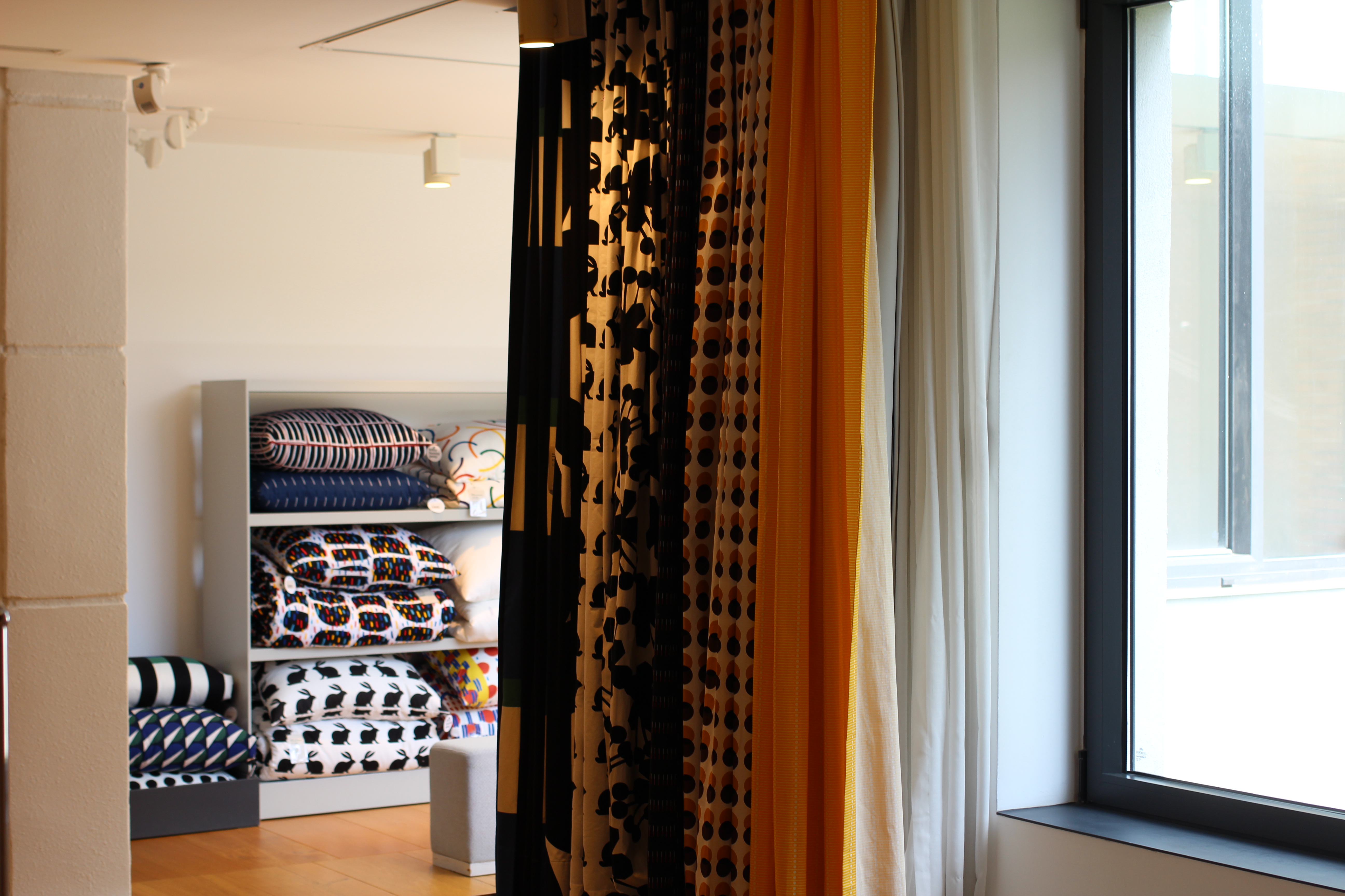 한쪽에는 쿠션과 담요로 보이는 것들이 차곡차곡 놓여져 있었는데요. 알레산드로 멘디니가 생각나는 디자인도 보였어요.