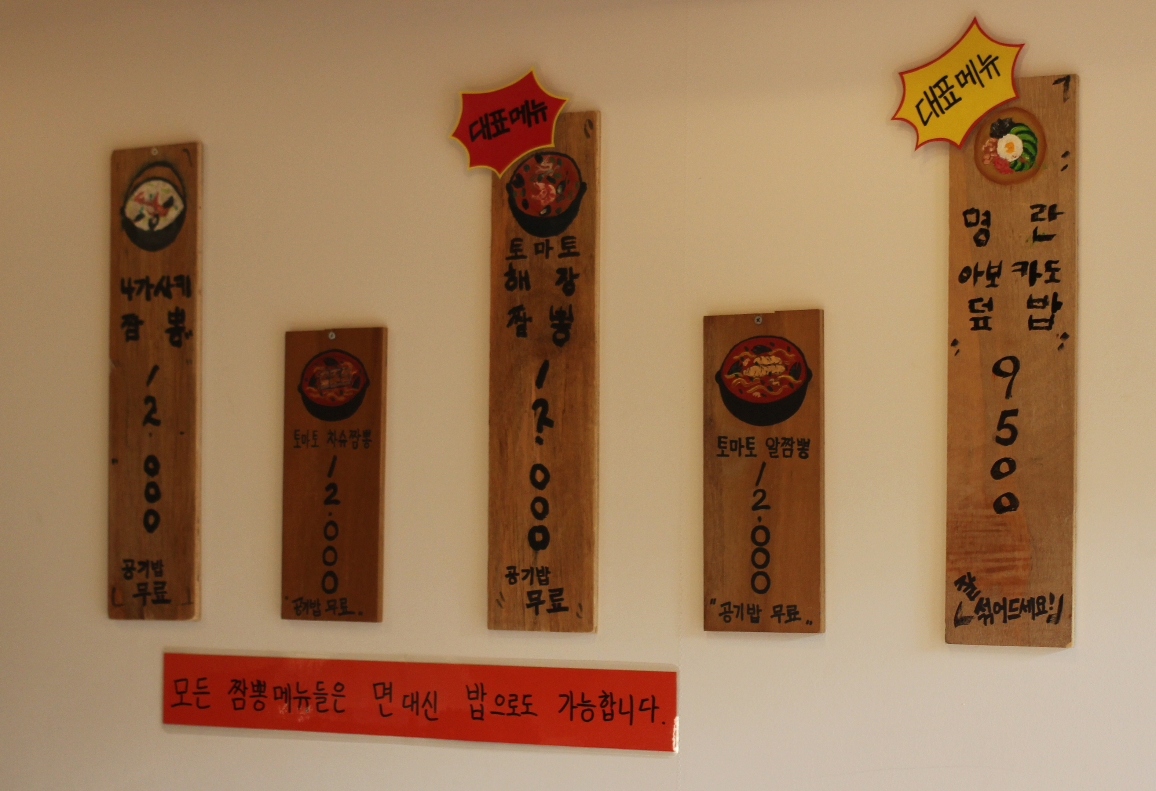 대표메뉴판을 찍어본다. 나가사키짬뽕, 토마토차슈짬뽕, 토마토해장짬뽕, 토마토알짬뽕, 명란아보카도덮밥.. 명란 아보카도 덮밥도 많이들 시키더라.