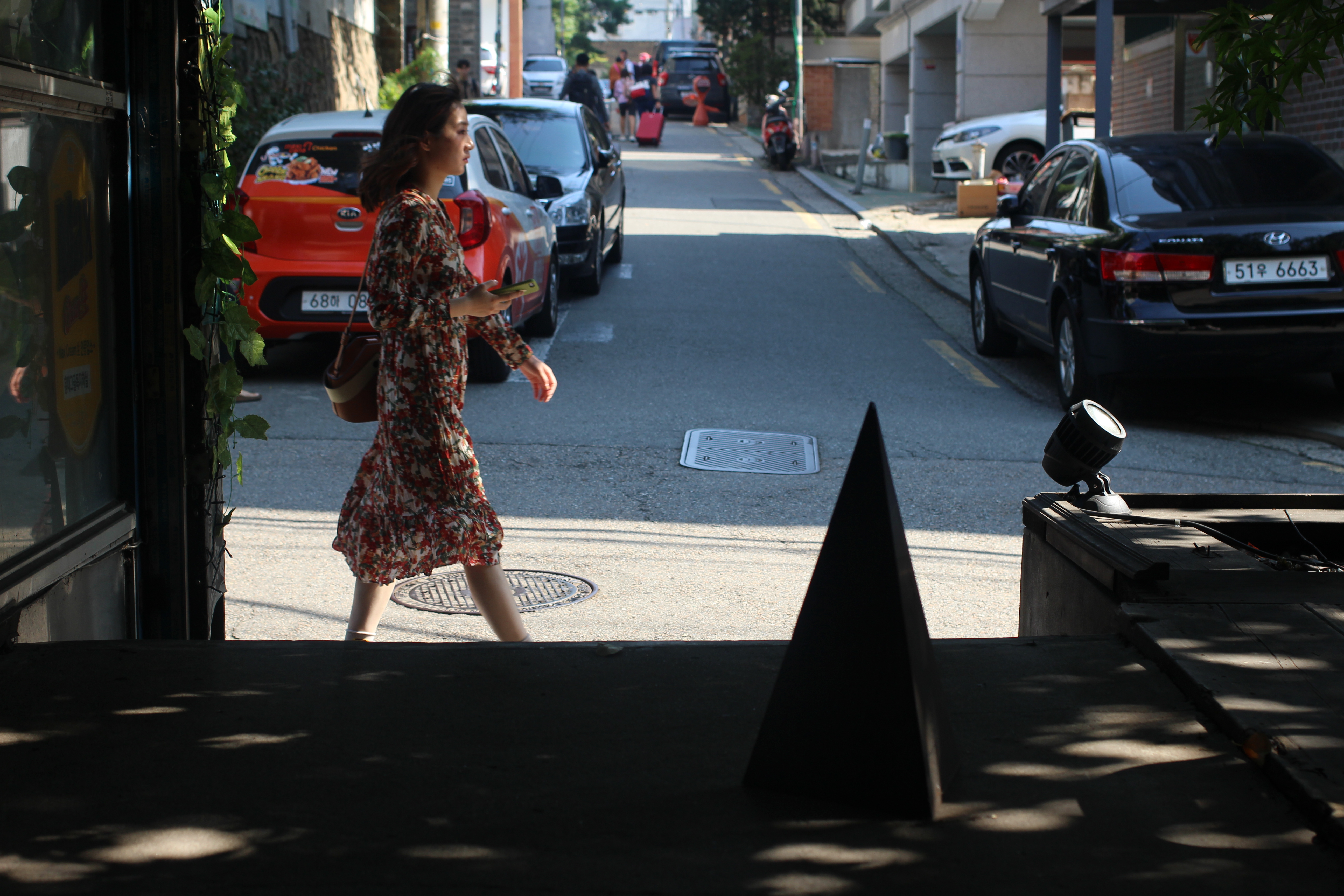 오벌은 녹색간판의 햄버거 집 옆 계단에 있고 간판도 없다. 이렇게 뾰족한 것만 하나 서 있을 뿐이다.