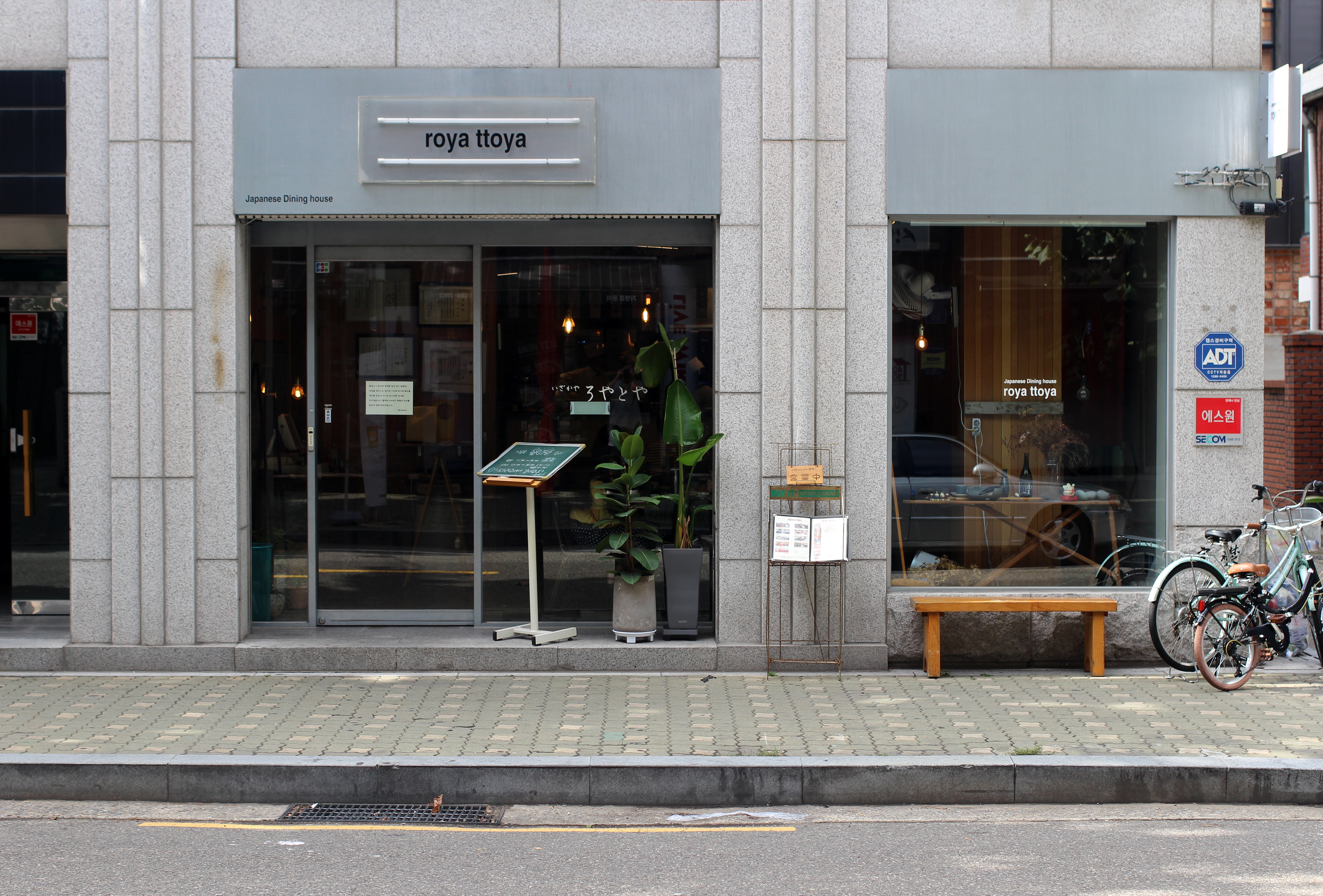 로야토야 입구에는 대기하는 사람들이 앉을 수 있는 벤치와 메뉴판이 놓여 있다.