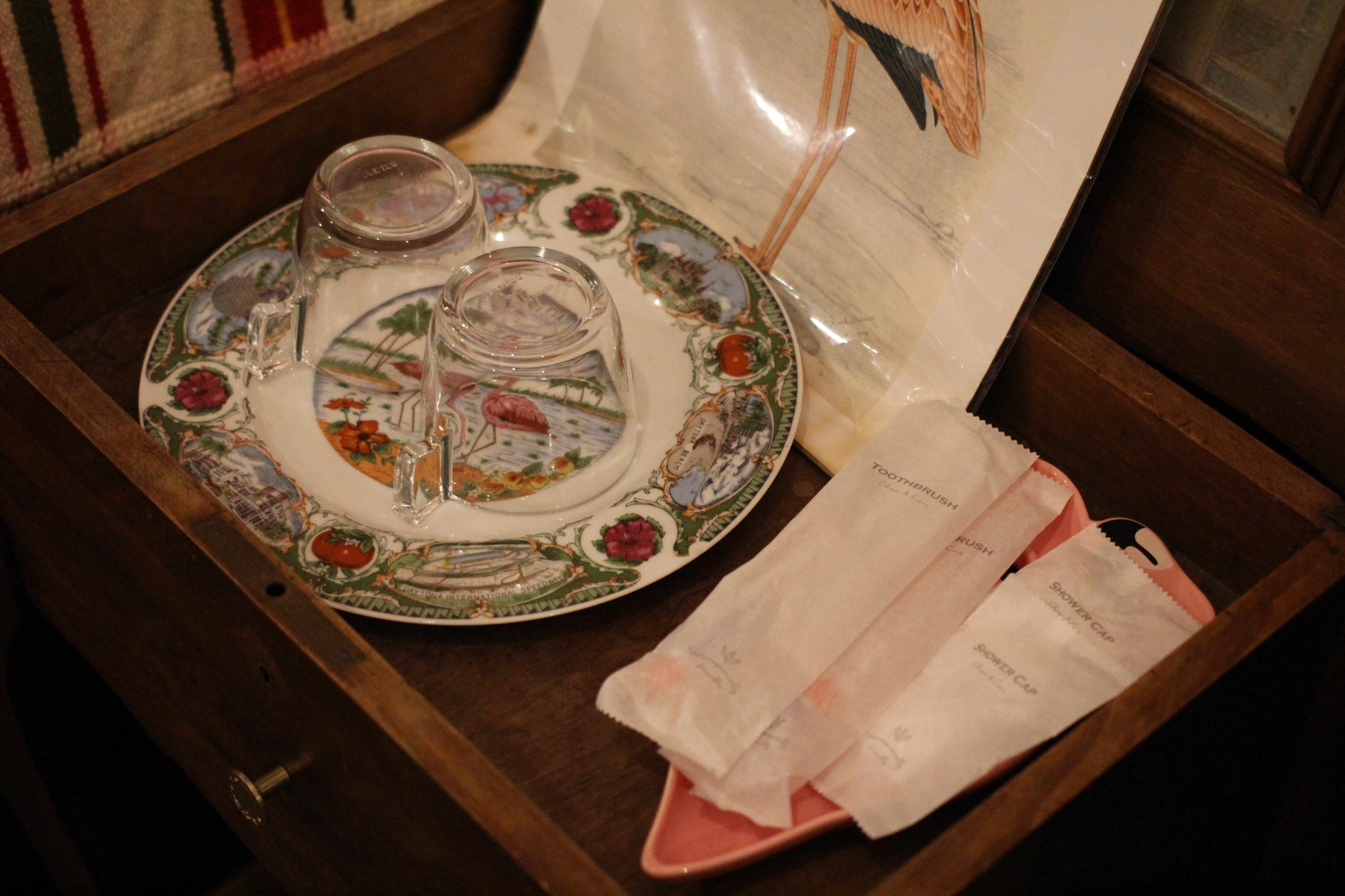 컵이랑 칫솔, 샤워캡 같은 것들이 마련되어 있었다.