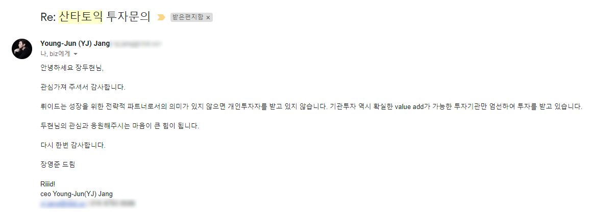 유튜브에서 산타토익 대표의 동영상을 봤다. 서비스에 대한 설명과 확신, 그리고 그동안의 과정이 마음을 움직였다. (군대에서 여자친구가 바람이 난 것에 동지애를 느낀 건 안 비밀..) 투자를 해본 적이 없었지만 투자가 하고 싶어졌다. 수중에 있던 돈 천만원을 투자하고 싶다고 메일을 보냈다. 어떤 반응이 올지 궁금했다. 생각보다 훨씬 빠르게 회신이 왔다.