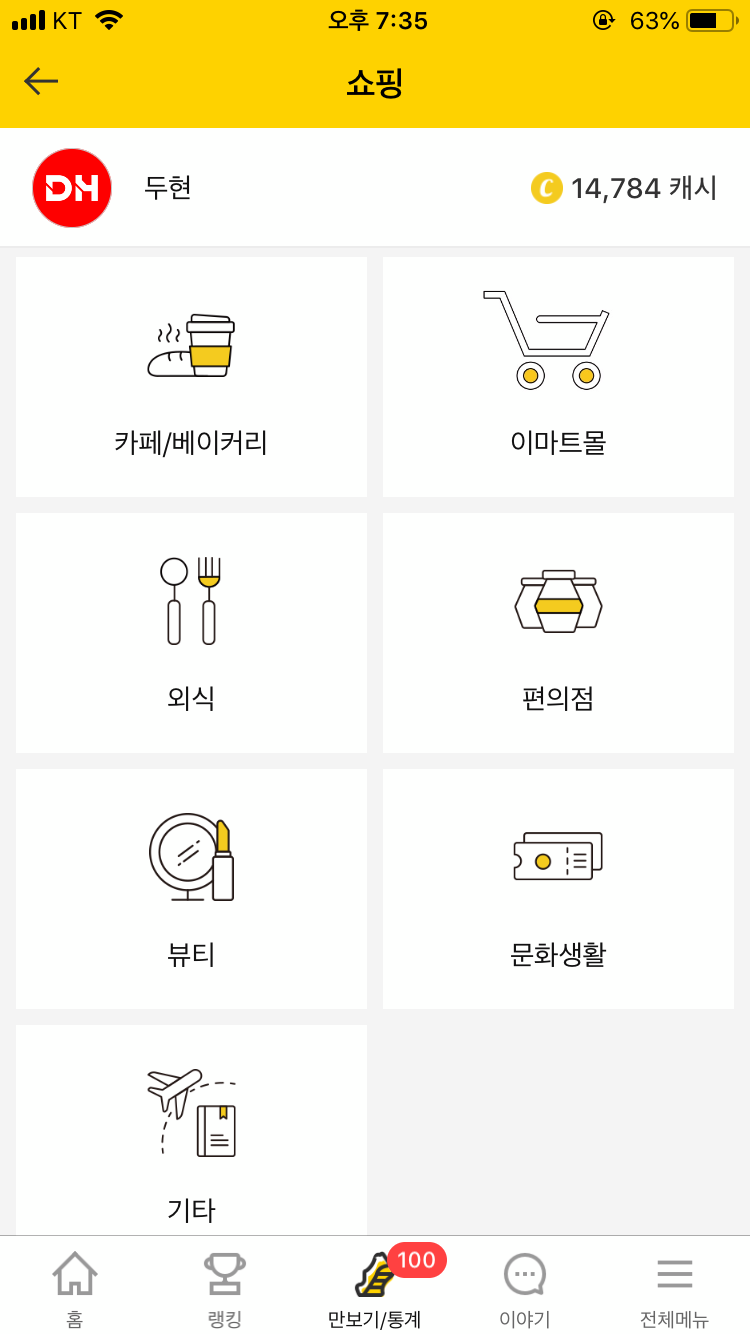 카페/베이커리, 외식, 편의점, 뷰티, 문화생활, 기타가 있는데 우리가 여기서 주목해야 할 항목은 카페/베이커리와 편의점 정도다. 나머지 카테고리는 실제 상품금액에 비해 과도한 캐시를 요구하기 때문이다. 예를 들어 치킨 한마리에 2만 포인트 정도면 먹을 수 있어야 하는데 4만 포인트를 책정해 두었다. 4만 포인트 모으려면 400만보를 걸어야 하고 단순히 계산해봐도 1년 반동안 하루도 빠짐없이 걸어야 모을 수 있는 포인트다.
