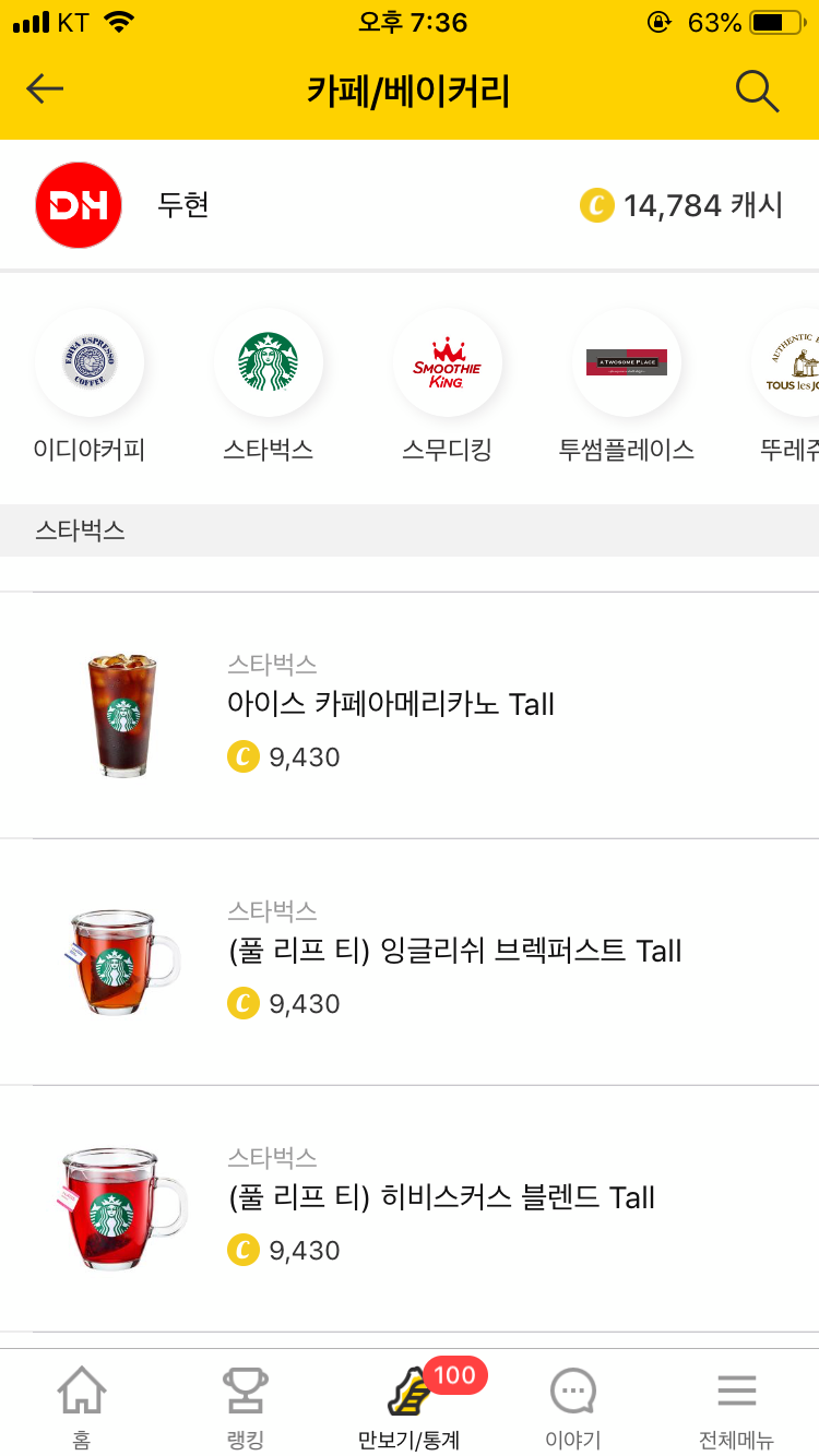 카페/베이커리 역시 마찬가지다. 스타벅스, 이디야, 뚜레주르, 투썸 등 유명한 카페와 뚜레쥬르 등 유명 베이커리에서 빵과 음료를 즐길 수 있다. 돈도 절약하고 건강도 챙길 수 있는 일석이조 앱 캐시워크! 짠돌이에게 추천한다.