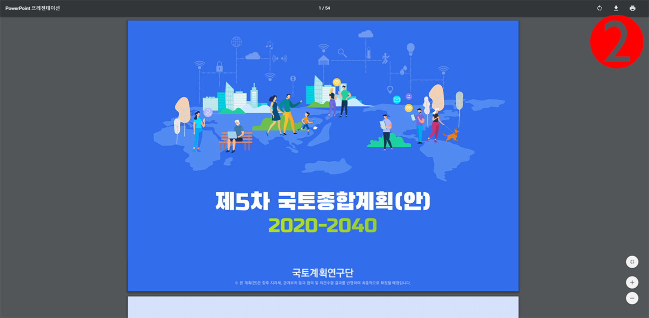 연구자료에서 지역별 발전방향을 볼 수도 있고 1번의 다운로드 버튼을 눌러 국토종합계획안 PDF 파일을 볼 수도 있다.