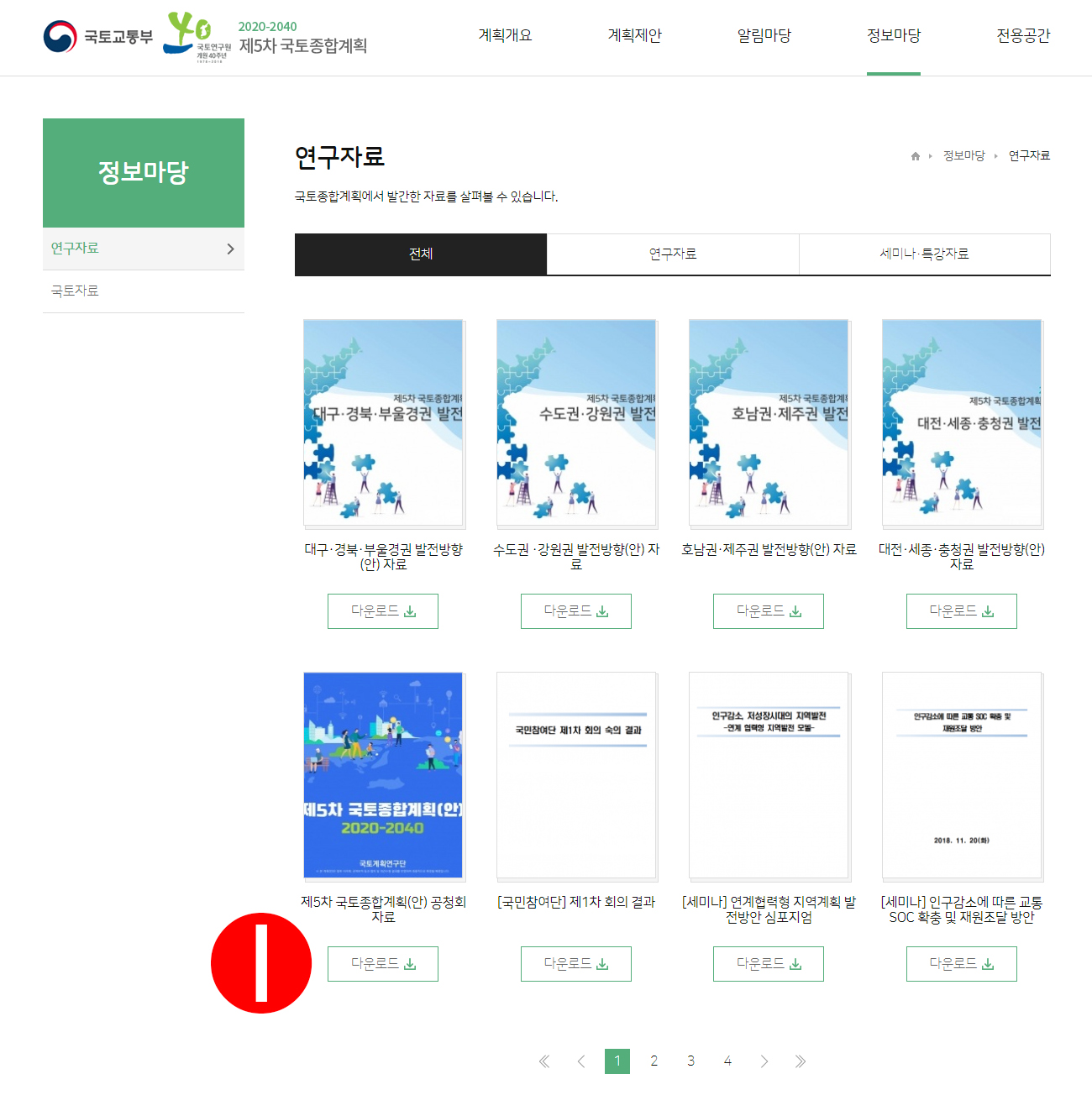 연구자료에서 지역별 발전방향을 볼 수도 있고 1번의 다운로드 버튼을 눌러 국토종합계획안 PDF 파일을 볼 수도 있다.