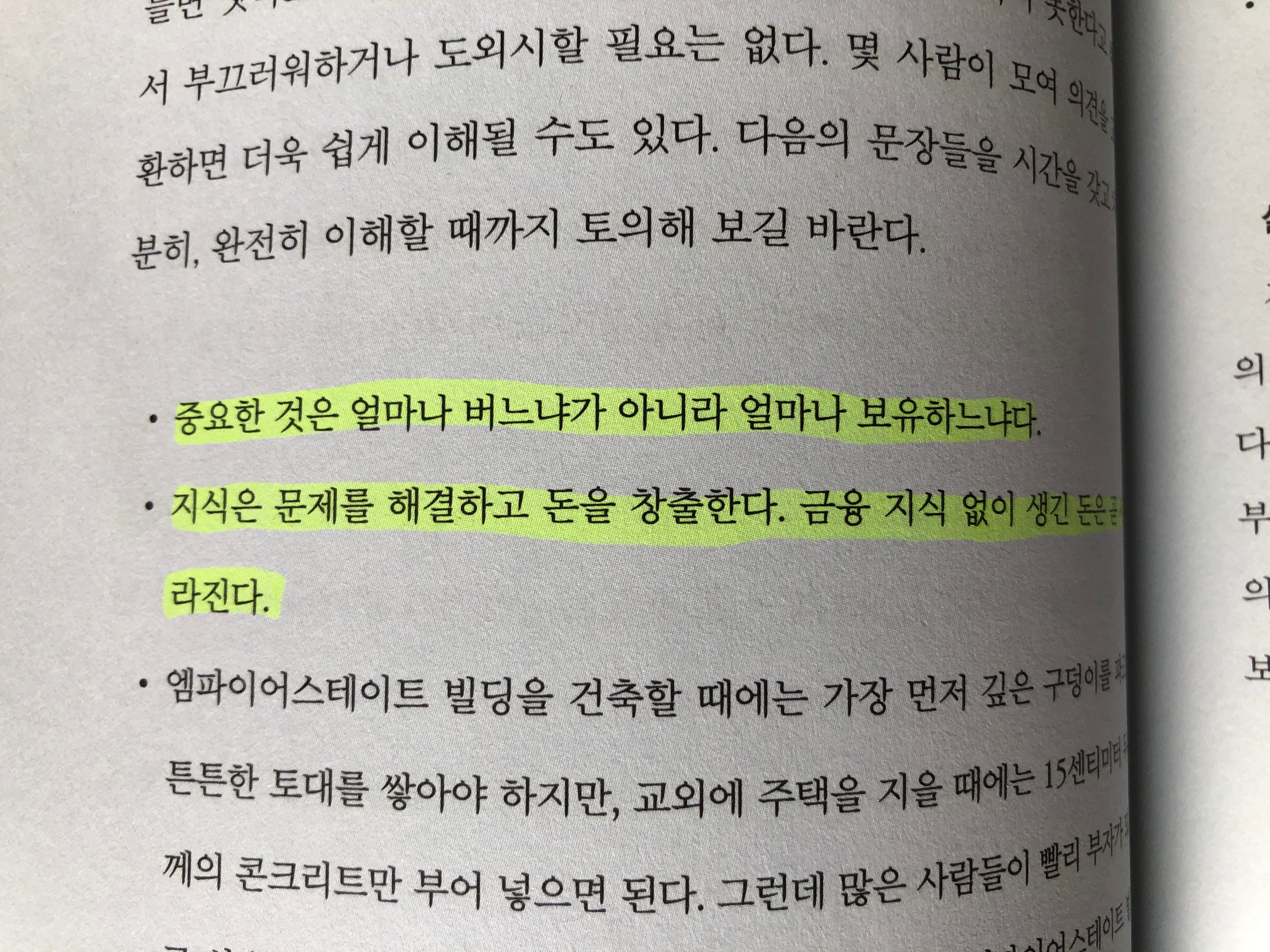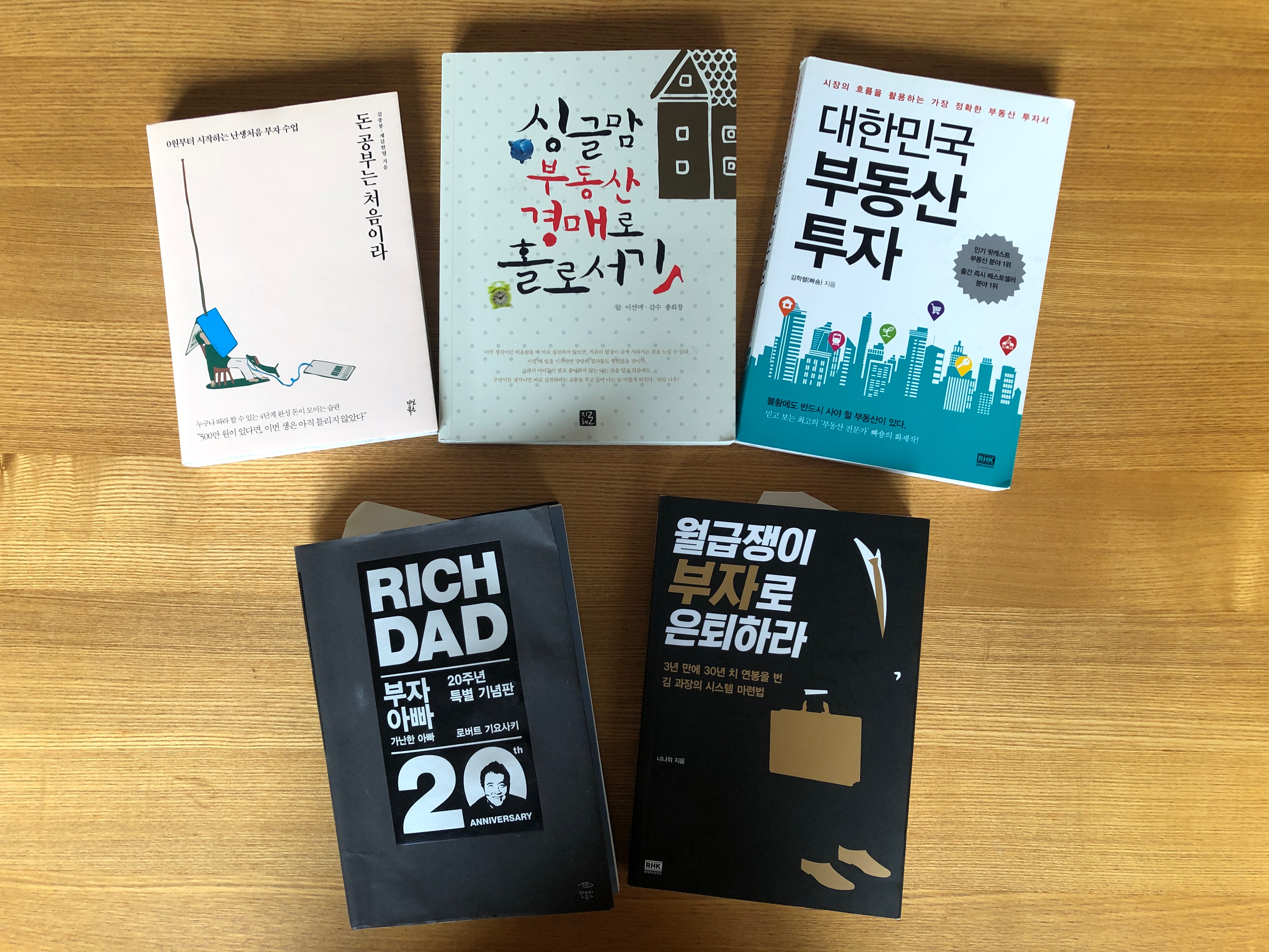 돈공부는처음이라부터 시계방향순서로 읽었다. 이 중에서 가장 좋았던 책은 부자아빠가난한아빠였다. 부자아빠가난한아빠와 월급쟁이부자로은퇴하라는 책 위로 종이가 삐져나온 것을 볼 수 있다. 아직 책을 덜 읽었다.