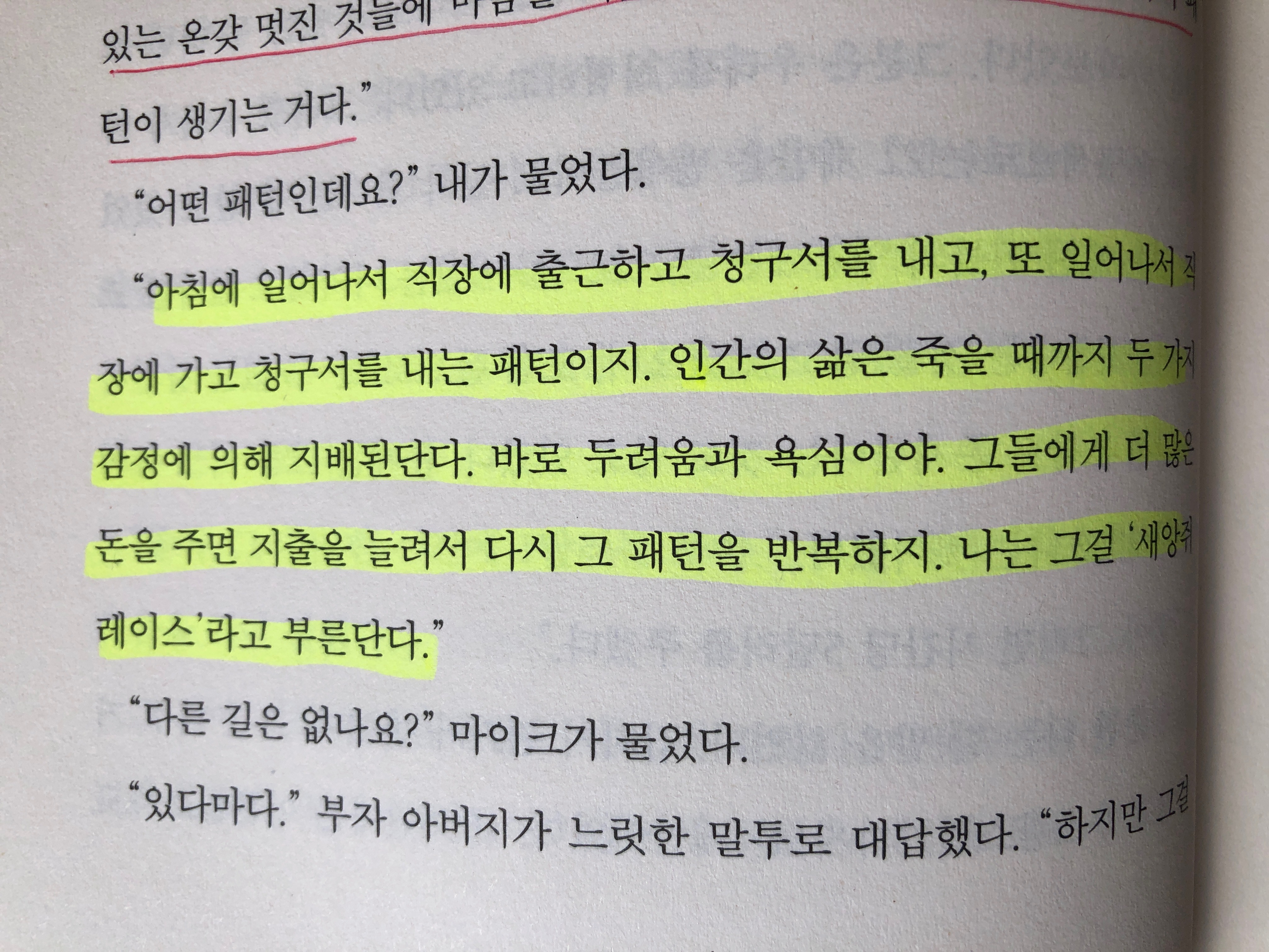 "아침에 일어나서 직장에 출근하고 청구서를 내고, 또 일어나서 직장에 가고 청구서를 내는 패턴이지. 인간의 삶은 죽을 때까지 두 가지 감정에 의해 지배된단다. 바로 두려움과 욕심이야. 그들에게 더 많은 돈을 주면 지출을 늘려서 다시 그 패턴을 반복하지. 나는 그걸 '생쥐레이스'라고 부른단다."