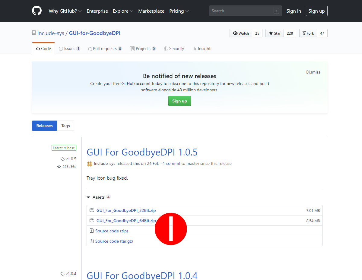위 사이트에 접속하면 아래 화면이 보인다. 1번의 GUI_For_GoodbyeDPI_64Bit.zip 파일을 클릭하고 내려받자.
