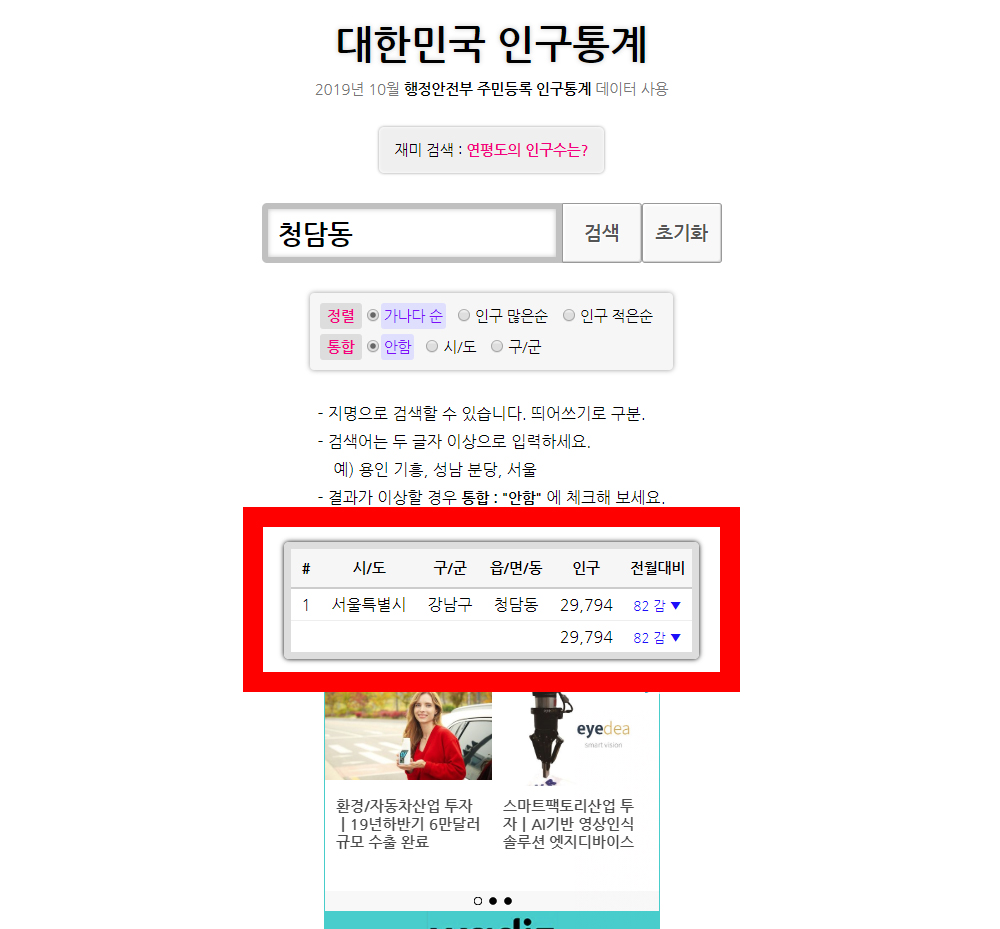 행정안전부 주민등록 인구통계 데이터를 사용해 동별 인구를 파악할 수 있다. 예를 들어 내가 청담동에 있는 상가를 구입할 예정이라고 한다면 사이트에 접속해 청담동이라고 입력하고 엔터키만 누르면 된다. 2019년 10월 기준으로 강남구 청담동에는 현재 29,794명의 인구가 거주하고 있다.