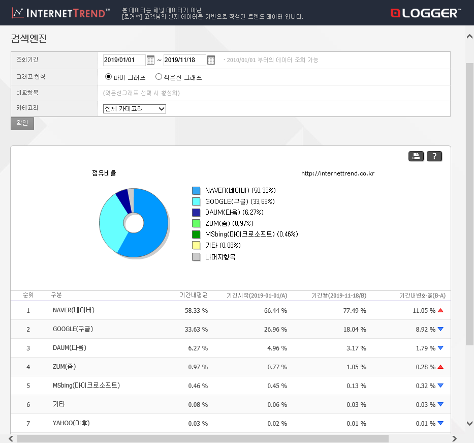 인터넷트렌드에 방문하면 검색엔진의 점유율을 확인할 수 있다. 자! 아래 이미지를 보자. 2019년 1월 1일부터 그저께까지의 데이터다. 네이버가 58%이며 그 뒤를 구글이 33%로 바짝 쫓고 있다. 몇년전만 하더라도 네이버는 70%~80%에 육박하는 검색량을 보이며 독점 기업으로 군림해왔다. 그러나 시간이 흘러 세상이 바꼈다.