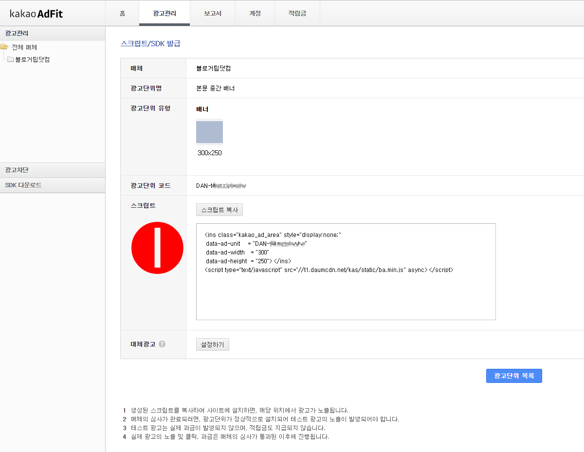 광고 사이즈를 고른 후 저장하면 자동으로 광고코드(스크립트)가 생성된다. 1번의 스크립트 복사 버튼을 눌러 광고코드를 복사해둔다.