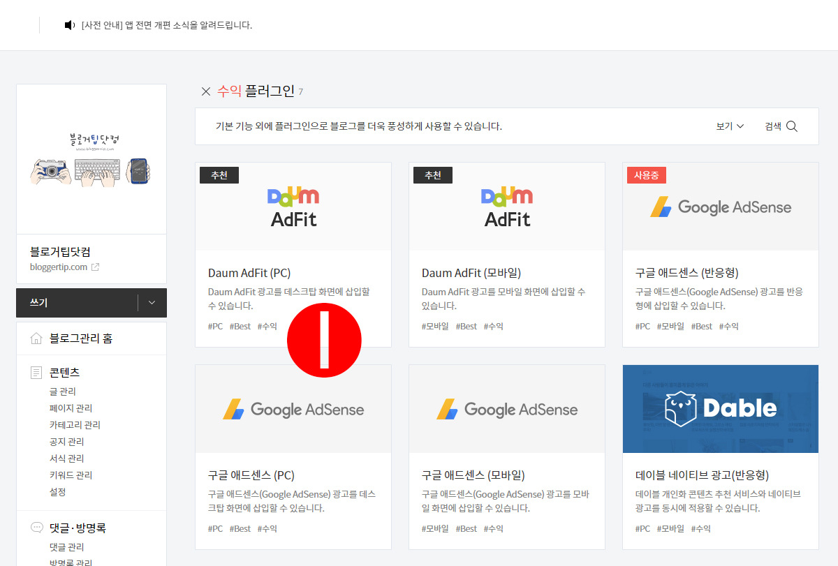 티스토리 관리자 화면에서 플러그인을 눌러 다음 애드핏을 찾자. 1번의 PC버전을 눌러야 반응형 스킨에서 광고배너가 작동한다.