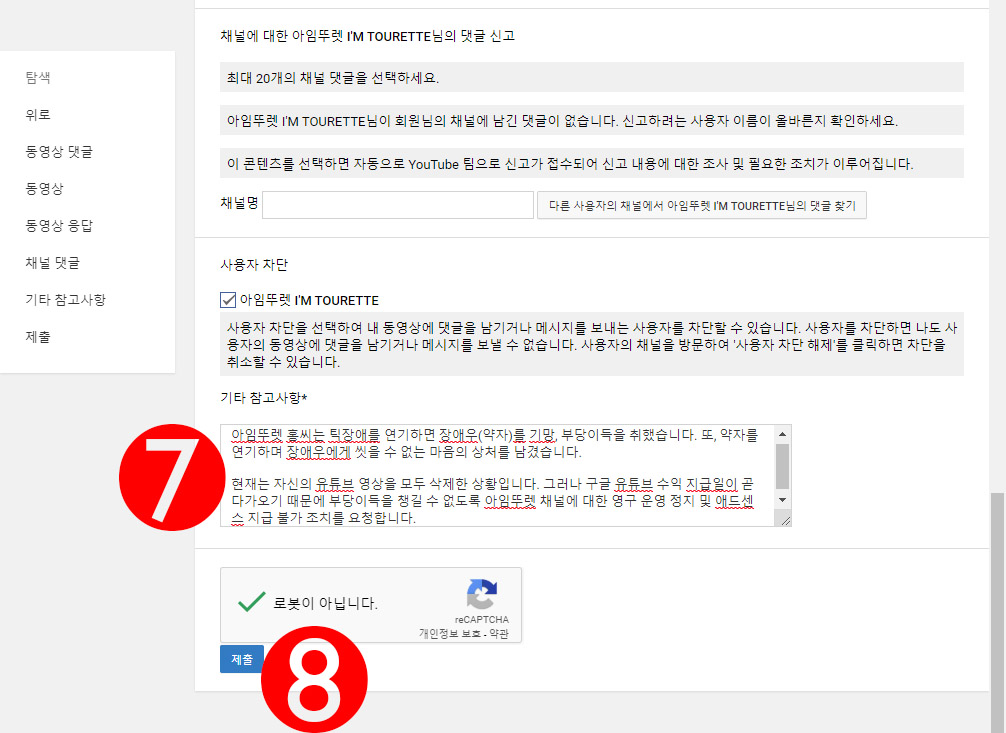 7번 참고사항에 본인이 하고 싶은 말을 하면 된다. 여기에 아임뚜렛의 잘못을 자세히 적으면 적을수록 좋다. 아임뚜렛이 어떤 잘못을 했고 장애우들에게 어떤 피해를 입혔는지 적고, 언론사(구글에서 정부가 지원하는 언론사라고 표시된 지상파가 유리)가 올린 뉴스기사나 유튜브 뉴스 동영상의 주소를 함께 넣어주면 아주 좋다. 8번에서 로봇이 아닙니다에 체크하고 제출 버튼을 누르면 된다.