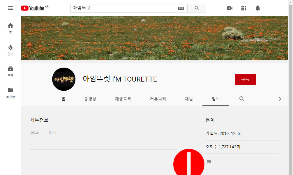 위의 주소에 접속해 홍씨(아임뚜렛 유튜브 운영자)의 유튜브 채널에 들어가면 아래의 화면이 나온다. 깃발 버튼(사용자 신고 기능)을 누르자.