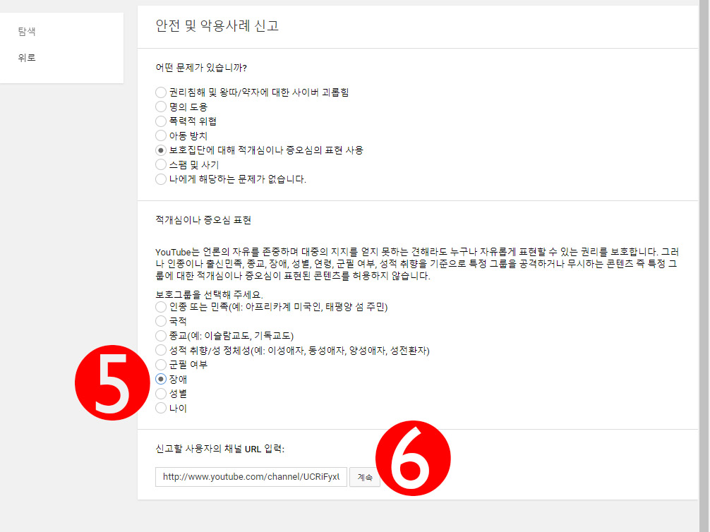 3번의 보호집단에 대한 증오심 표현을 선택하고 4번의 신고 버튼을 누르자.