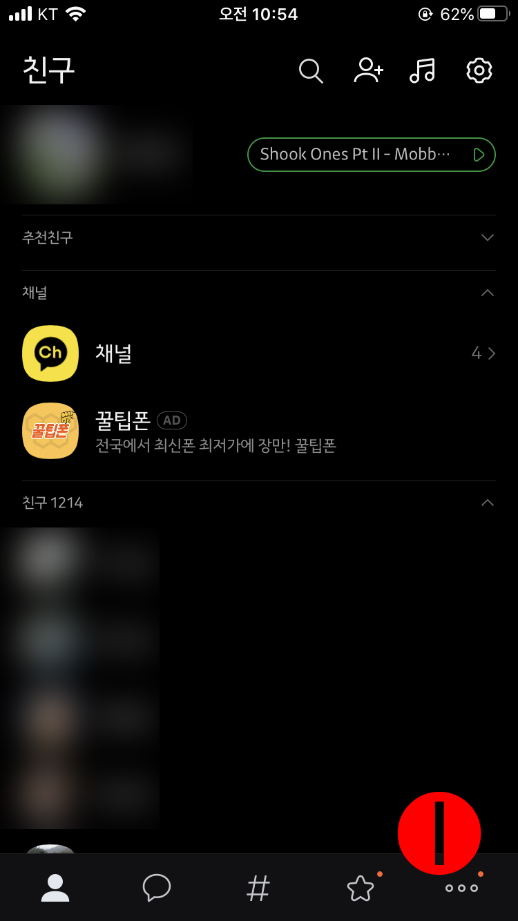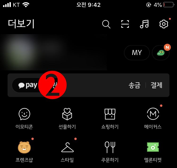 카카오톡을 실행하고 하단 우측의 버튼(1번)을 클릭하자. 다음 화면에서 2번의 pay 클릭!