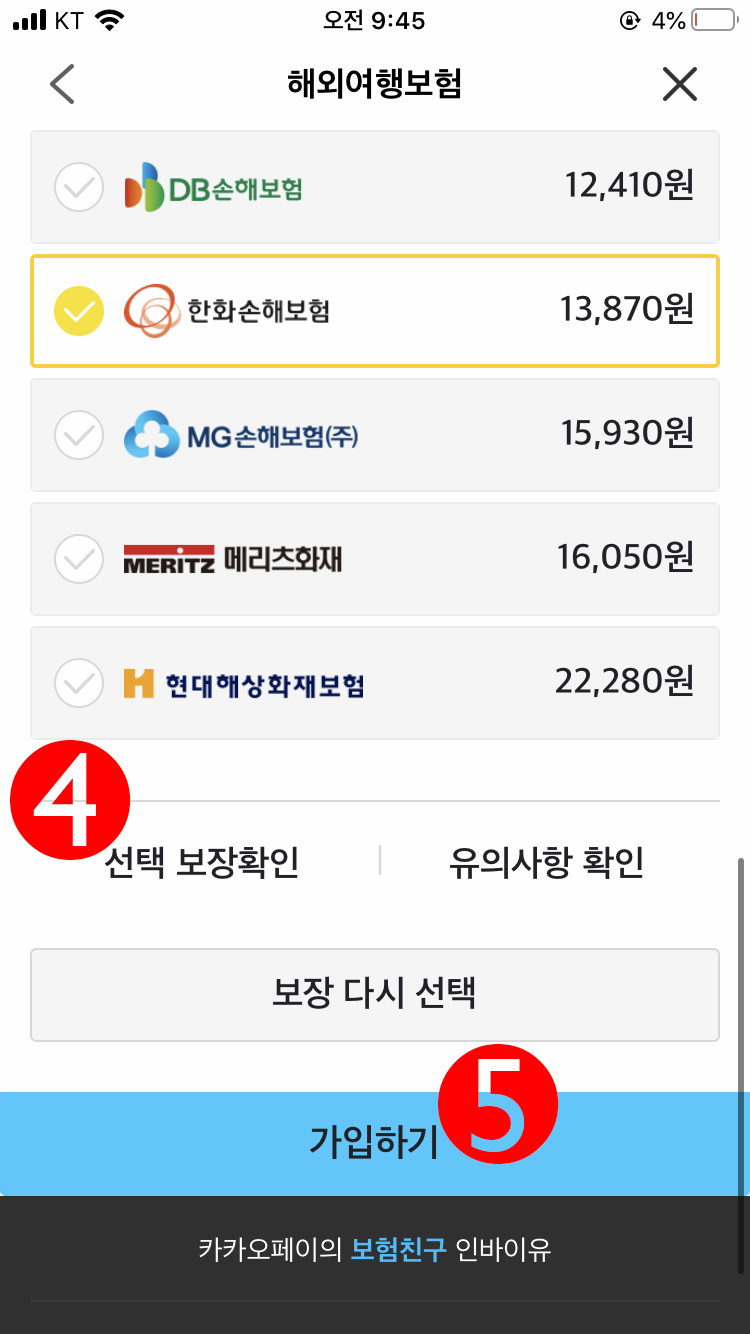 3번의 여행보험을 클릭하고 보험사가 나오면 본인이 원하는 보험사를 선택하면 된다. 나는 한화보험을 그나마(?) 괜찮다고 생각하며 한화손해보험을 선택했다. 4번의 선택 보장확인을 반드시 읽어봐야 한다. 5번의 가입확인 버튼을 누르면 된다. 보험가입사실이 카카오톡으로 날아온다. 궁금한 내용은 보험중개회사인 인바이유 고객센터(1644-9381)에 전화하면 된다. 참고로 월급을 적게 받는지 상담원이 친절하지는 않다.