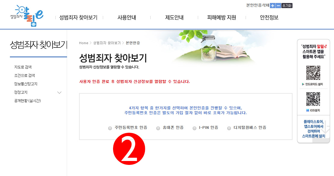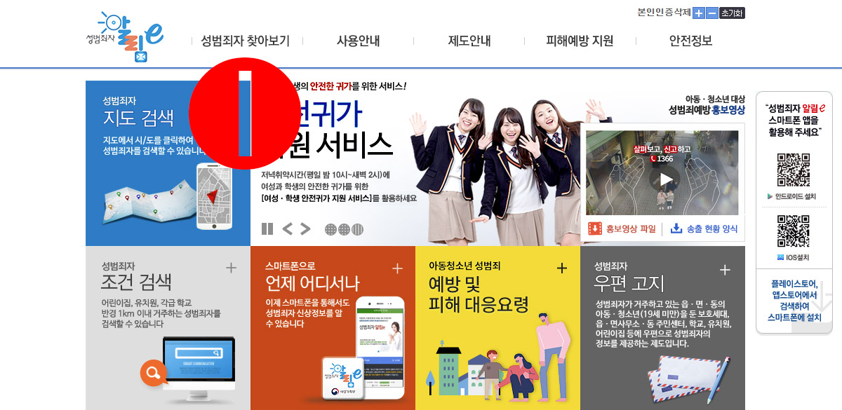 사이트에 접속해 1번의 성범죄자 찾아보기 메뉴를 클릭하자.