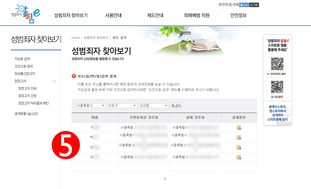3번에서 지역을 검색하면 된다. 나는 마포구에 살고 있기 때문에 우리 동네에 성범죄자가 있는지 찾아보기로 했다.