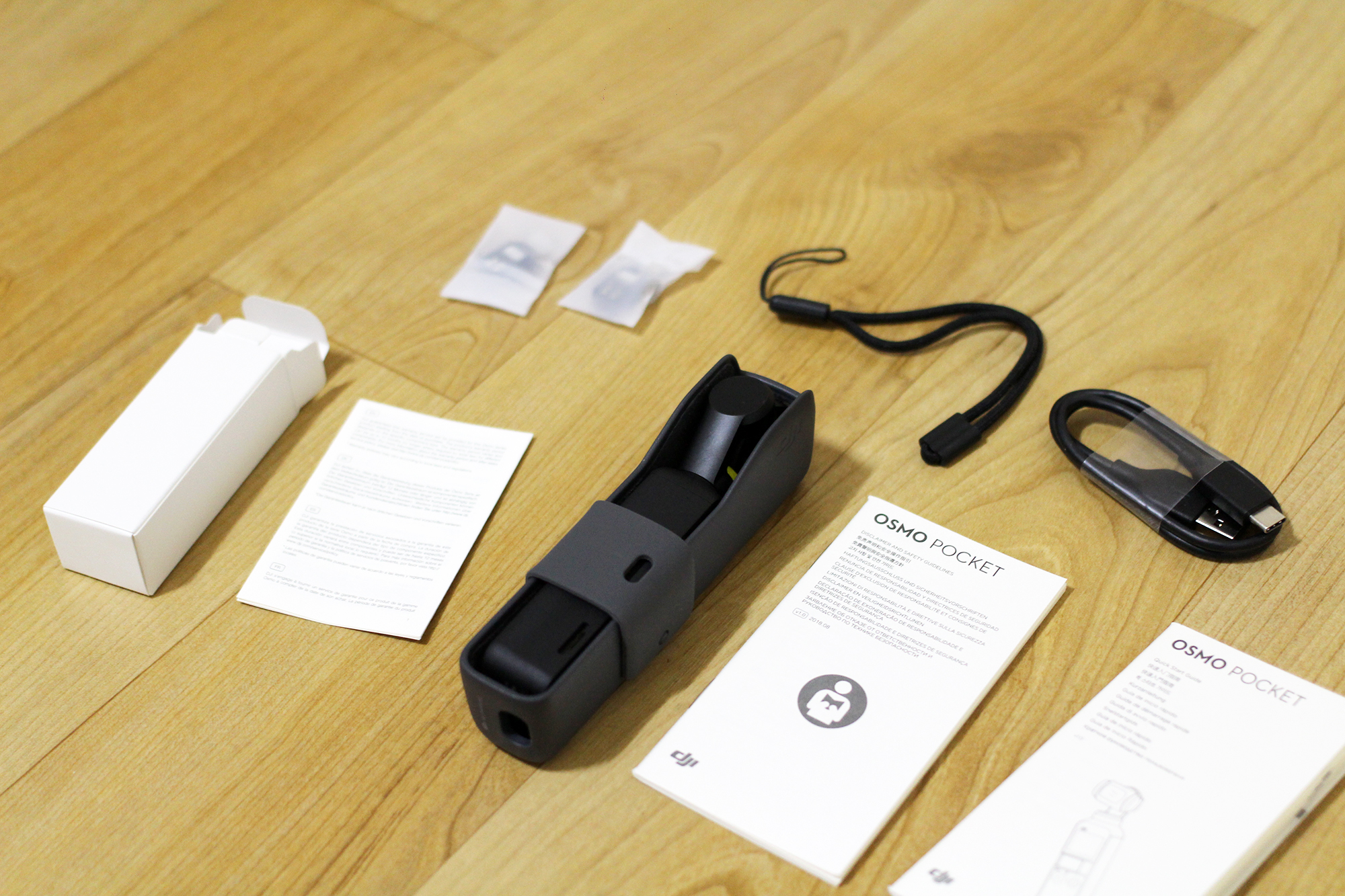 케이스를 열면 구성품들이 나온다. 설명서, 오즈모포켓 본체, 케이스, 스트랩, 전원케이블, 젠더가 들어 있다.