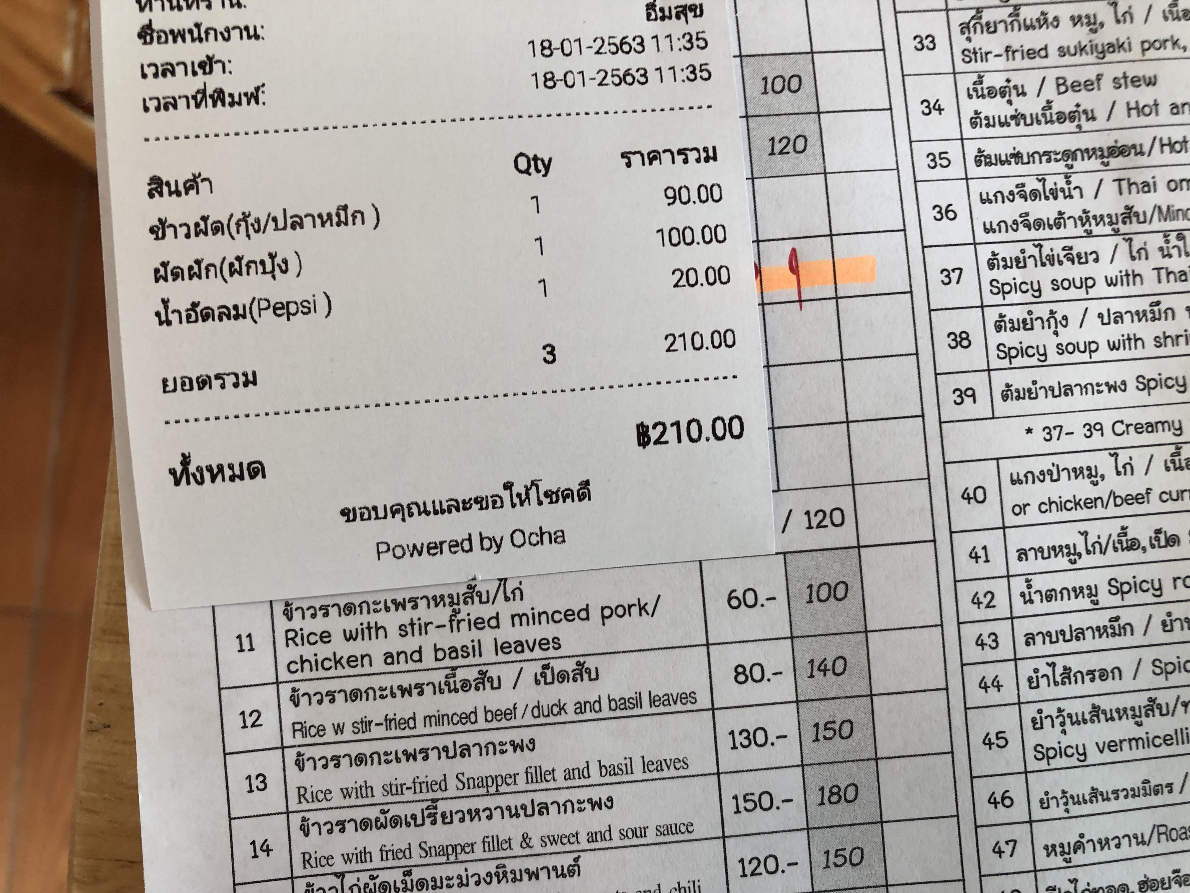 요리 2개랑 음료 1개 해서 총 210바트가 나왔다. 우리 돈으로 8천원이니까 태국 현지 식당 치고는 비싼 편이다. 그렇지만 위생과 맛을 생각한다면 엄청 저렴하다고 할 수 있다. 임숙씨 최고!