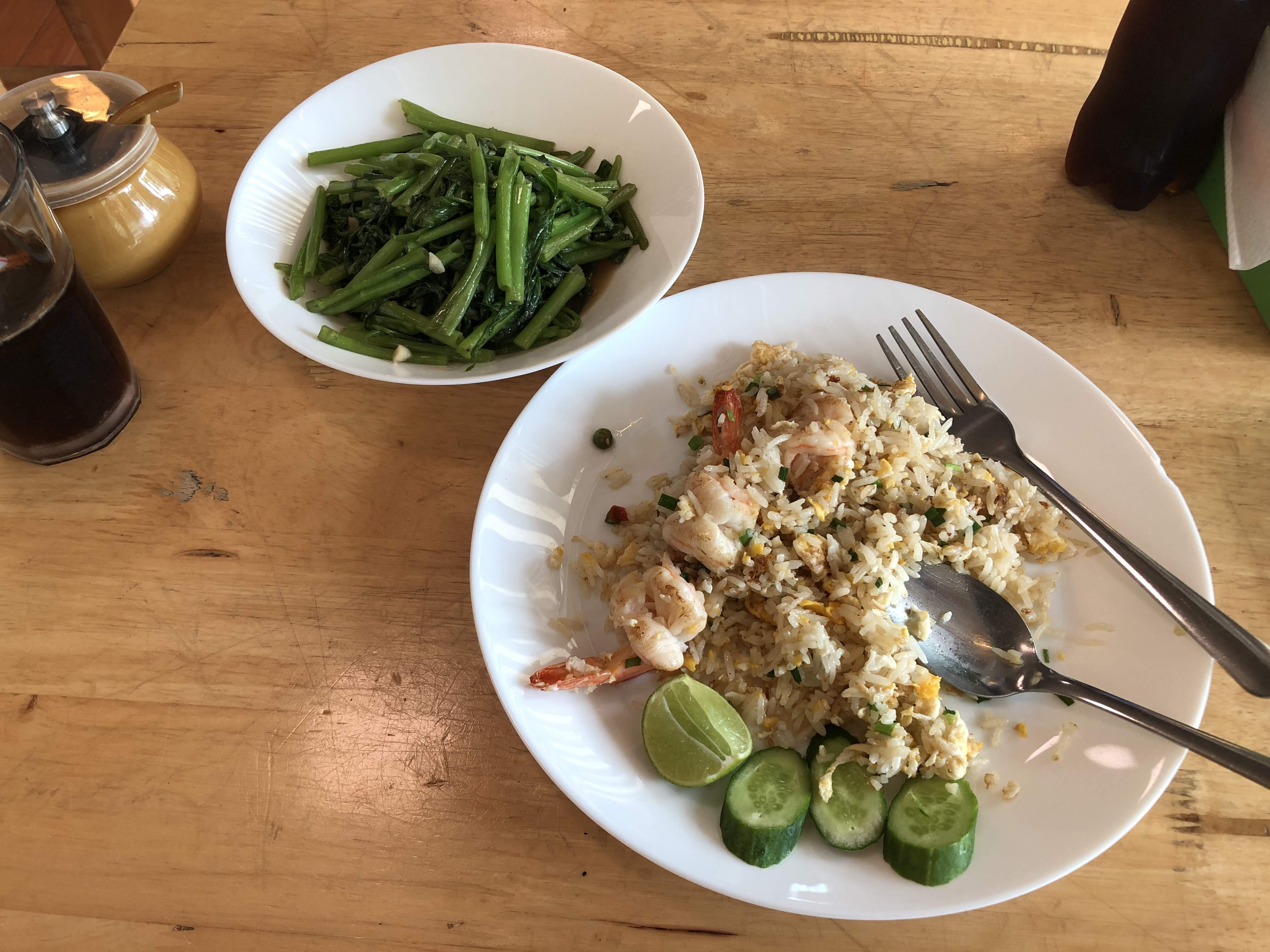나는 새우볶음밥, 모닝글로리 볶음, 펩시콜라를 시켰다. 한국에서는 탄산음료를 마시지 않지만 방콕에 오면 즐겨 마신다. 워낙 태국요리가 기름지다 보니..