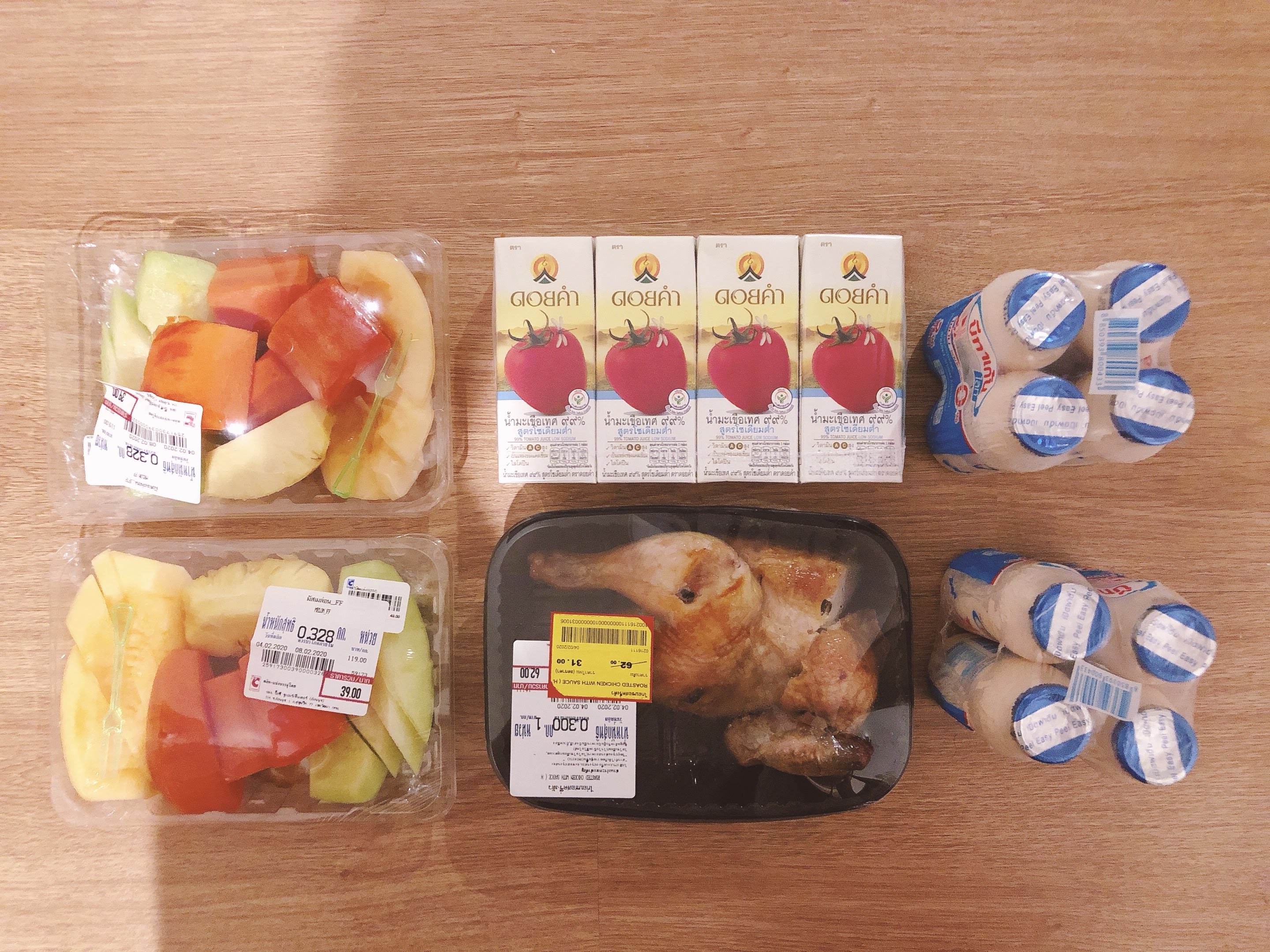 어제 빅씨에 오후 7시쯤 방문했다. 통닭 한마리에 31바트였다. 우리돈 1,300원 정도 된다. 과일은 한팩에 39바트였다. 1,500원이다. 혼자서 먹기에는 많은 양이다. 아래 사진에서 제일 비싸게 주고 산 게 도이캄 주스다. 왕실에서 인증한 브랜드로 과일 함유량이 쩐다. 실제로 딸기주스를 먹어보니 생과일 주스 맛이 났다. 토마토주스 4개에 68바트다. 2,600원이니까 주스 1개에 6백원~7백원 정도 되는 셈이다. 한국 같았으면 청와대 인증 유기농 태그 달고 나왔을테고 1개당 최소 2천원은 받았겠지? ㅋㅋㅋ 이거 다해서 256바트 나왔다. 우리돈으로 9,800원이다.