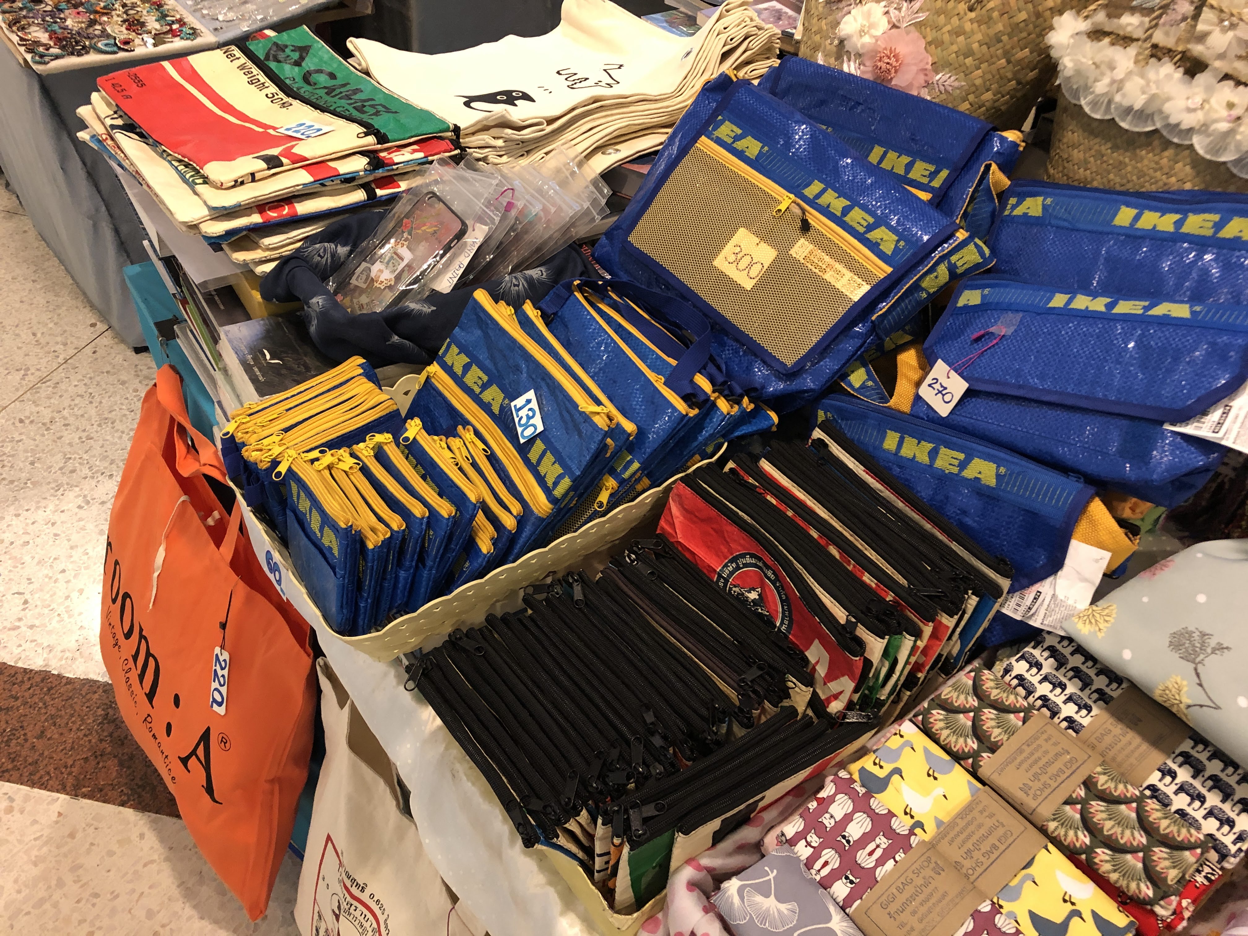 서점을 구경하러 들른 BACC는 전시작품을 관람하는 사람들로 붐볐다. 해프닝이라는 소품샵이 보여서 들어갔는데 아기자기한 물건들이 많았다. 태국도 소확행이 인기인가 보다. 발 디딜 틈이 없었다. 해프닝 문 바로 앞에 가방을 늘어놓고 파는 아주머니가 보였다. 이케아 가방이 눈에 들어왔다. 프라이탁 스타일로 재활용해서 만든 동전지갑도 있었다. 프라이탁이라고 하기엔 너무 얇아서 볼품 없었지만 색감도 좋고 가격이 아름다웠다. 60바트! 2천2백원 정도였다. 숙소에 동전이 많다. 동전을 주머니에 넣고 다니면 짤랑짤랑 거리고 꺼내기도 불편했는데 이참에 하나 사기로 했다. 이걸 손수 만드시냐고 물었더니 아는 동생이 만들고 본인은 가져다가 판다고 했다. 마음에 쏙 든다.