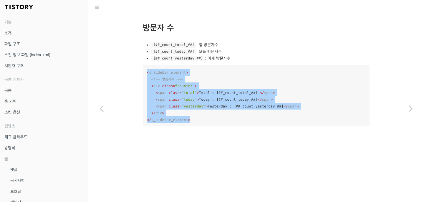 *티스토리 반응형 스킨 코드 보기 https://tistory.github.io/document-tistory-skin/sidebar/count.html