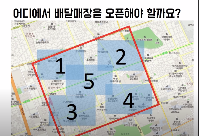 아래 이미지에 5개의 번호가 적혀 있는데 어느 위치가 제일 좋을까? 많은 사람들이 5번을 선택할 거다. 나머지 번호의 지역을 모두 커버할 수 있다는 생각을 하기 때문이다. 그런데 커피플라이 대표는 3번에 매장을 냈다고 한다. 주문이 들어오면 한번에 묶어가기 좋기 때문이라고 했다. 대표는 주로 피자집에서 10년간 일하며 고객을 만나왔다고 하는데 역시 경험에서 나오는 짬이 느껴졌다.