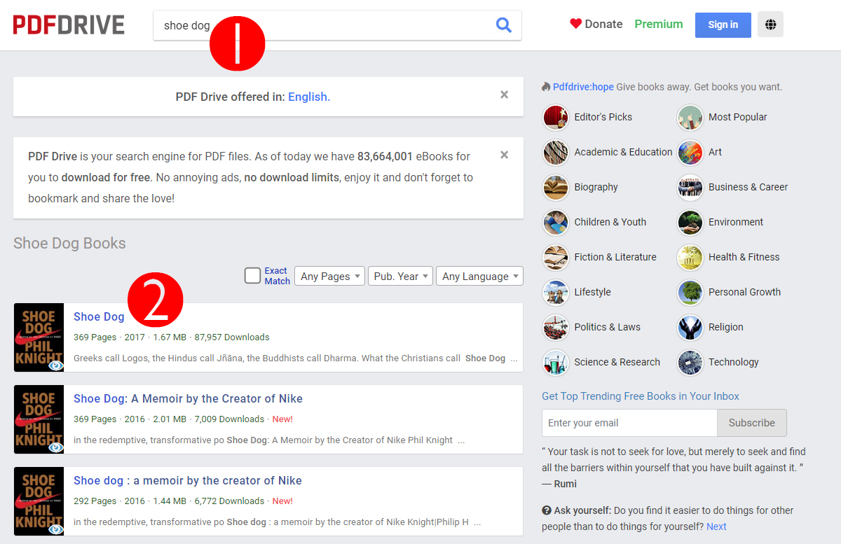 사이트에 접속해 상단의 검색창에 본인이 찾고자 하는 책의 이름을 입력하면 된다. 1번에 검색창에 슈독을 입력하니 아래 2번 영역에 슈독 책들이 나타난다. 8만회가 넘는다니 역시 나이키의 영향력은 거대하다. 2번 클릭!