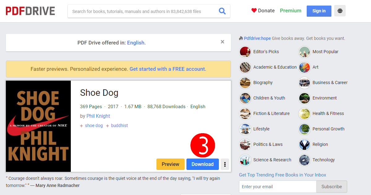 영상번역을 희망하고 있기 때문에 다큐나 미드를 주로 보고 있지만 텍스트도 본다. 잡지, 책, 뉴스기사 등을 읽어보는데 인터넷에서 원서를 찾다가 무료로 원서를 제공하는 사이트를 발견하여 블로그에 공유한다. 며칠 전에 쉬운 원서를 유튜브에서 추천받아 교보문고에 들렀다. 원서코너에서 로알드 달의 '찰리와 초콜릿 공장', 나이키 설립자의 '슈독' 두 권이 눈에 들어 왔다. PDF Drive에 내가 본 두 권의 원서가 모두 있었다. 원서 슈독은 현재 교보문고에서 19,800원에 팔리고 있다.