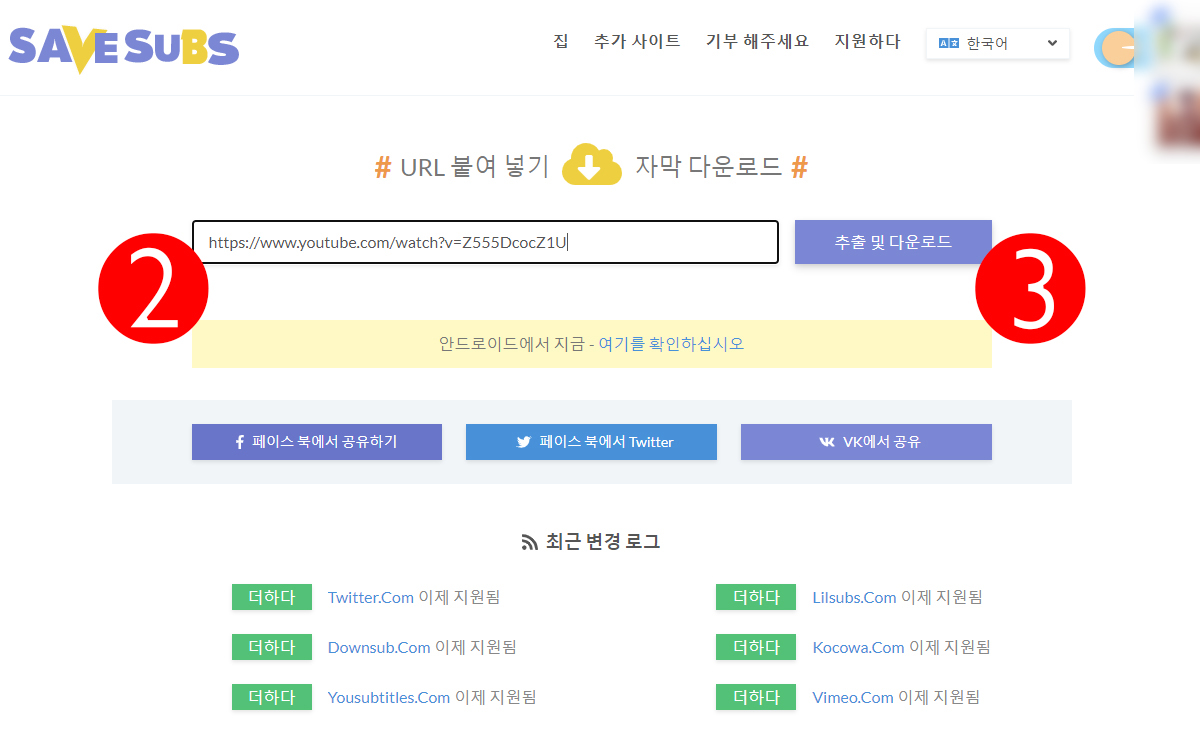 SAVE SUBS에 접속해 2번의 빈칸에 방금 복사한 유튜브 동영상 주소를 붙여넣고 2번의 추출 및 다운로드 버튼을 누르자.