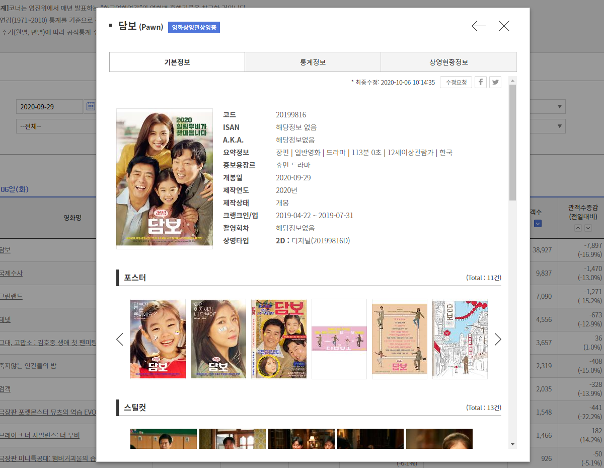영화 담보 제목을 클릭하면 기본정보, 통계정보, 상영현황정보를 볼 수 있다. 즐감!