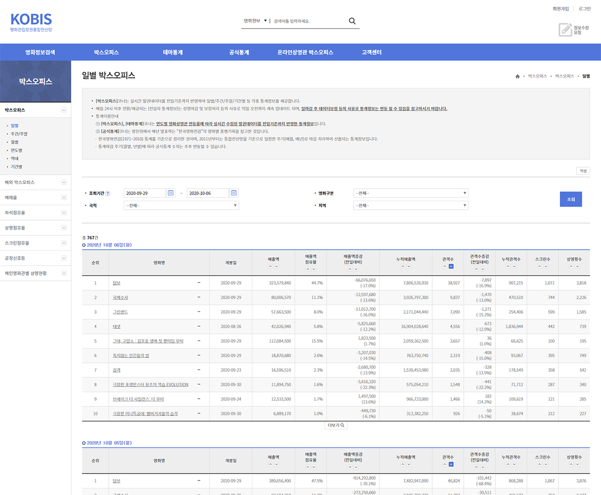 영화 관객수 매출액 예매율 확인하기 KOBIS