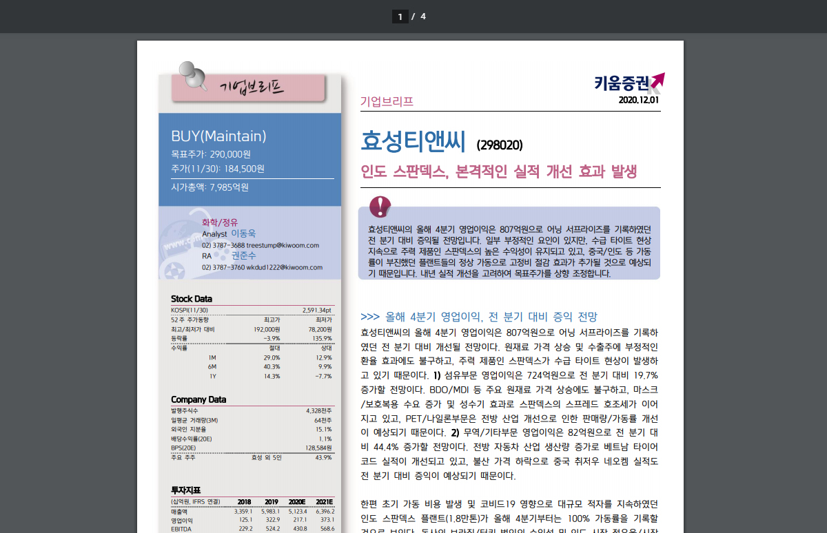 효성티앤씨에 대한 보고서가 올라와 있다. 키움증권에서 만든 보고서로 총 4페이지 분량이다.