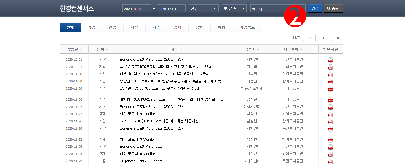 2번의 검색창에 특정 키워드를 입력해 자신이 원하는 정보를 검색할 수 있다. 아래는 코로나로 검색한 화면이다. 성공하는 투자, 성투하시길! :D