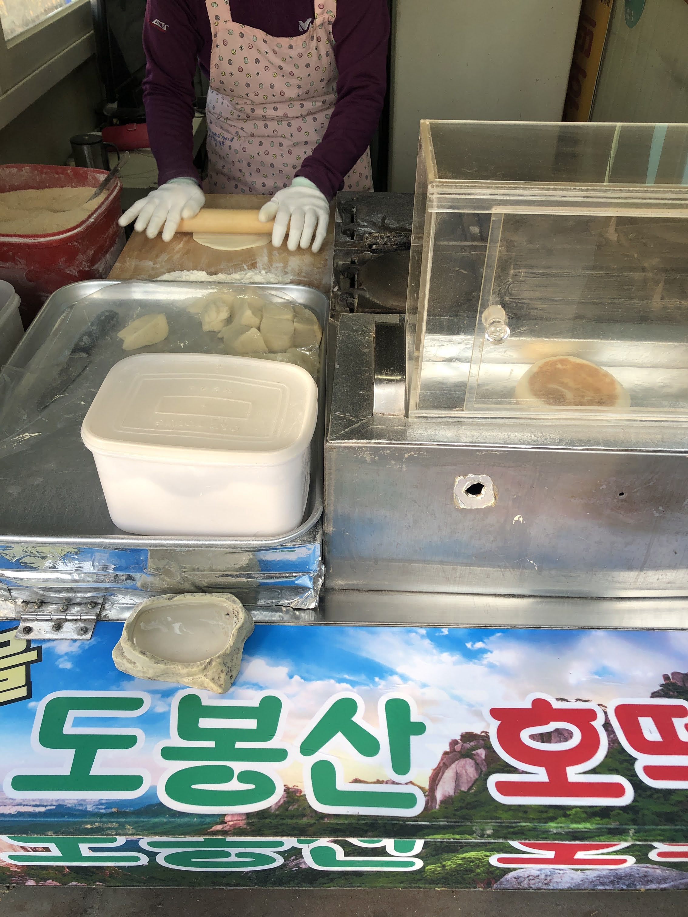 도봉산역 앞에 호떡집이 보였다. 아침을 먹고 나왔지만 그래도 재미삼아 호떡을 샀다. 호떡을 붕어빵 굽는 기계 안에다 굽는 게 특이했다. 좀 더 단백한 맛이 났지만 나는 옛날 호떡이 더 좋은데... 가격은 3개에 2천원이었는데 카드결제는 안되고 현금만 된다고 해서 계좌이체했다.