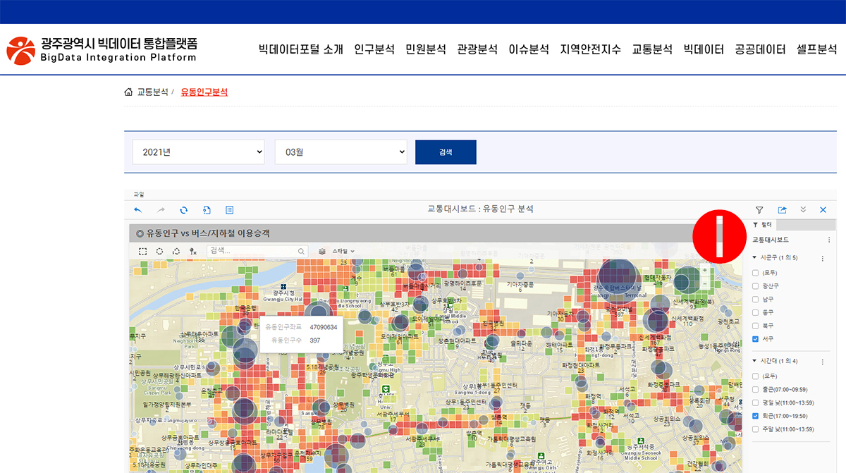 광역시는 빅데이터 빅데이트 통합플랫폼이라는 이름으로 교통량을 기반으로 한 유동인구 지도를 제공하고 있다. 광주광역시를 예로 유동인구를 분석해보자.