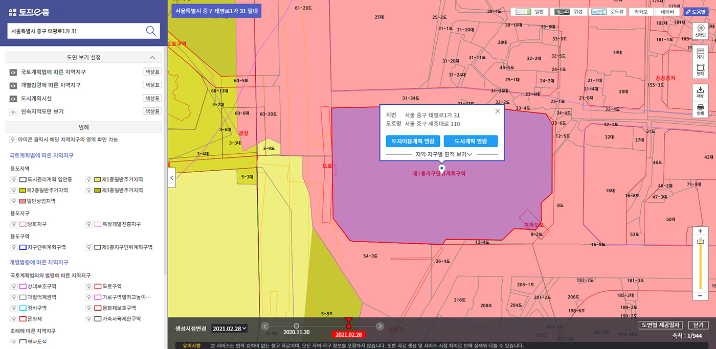 두둥! 이런 방식으로 자신의 투자하고자 하는 부동산 물건의 토지이용계획과 도시계획을 열람할 수 있어요. 성투하시길! :)