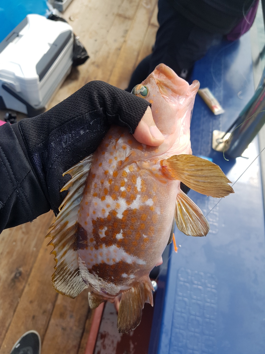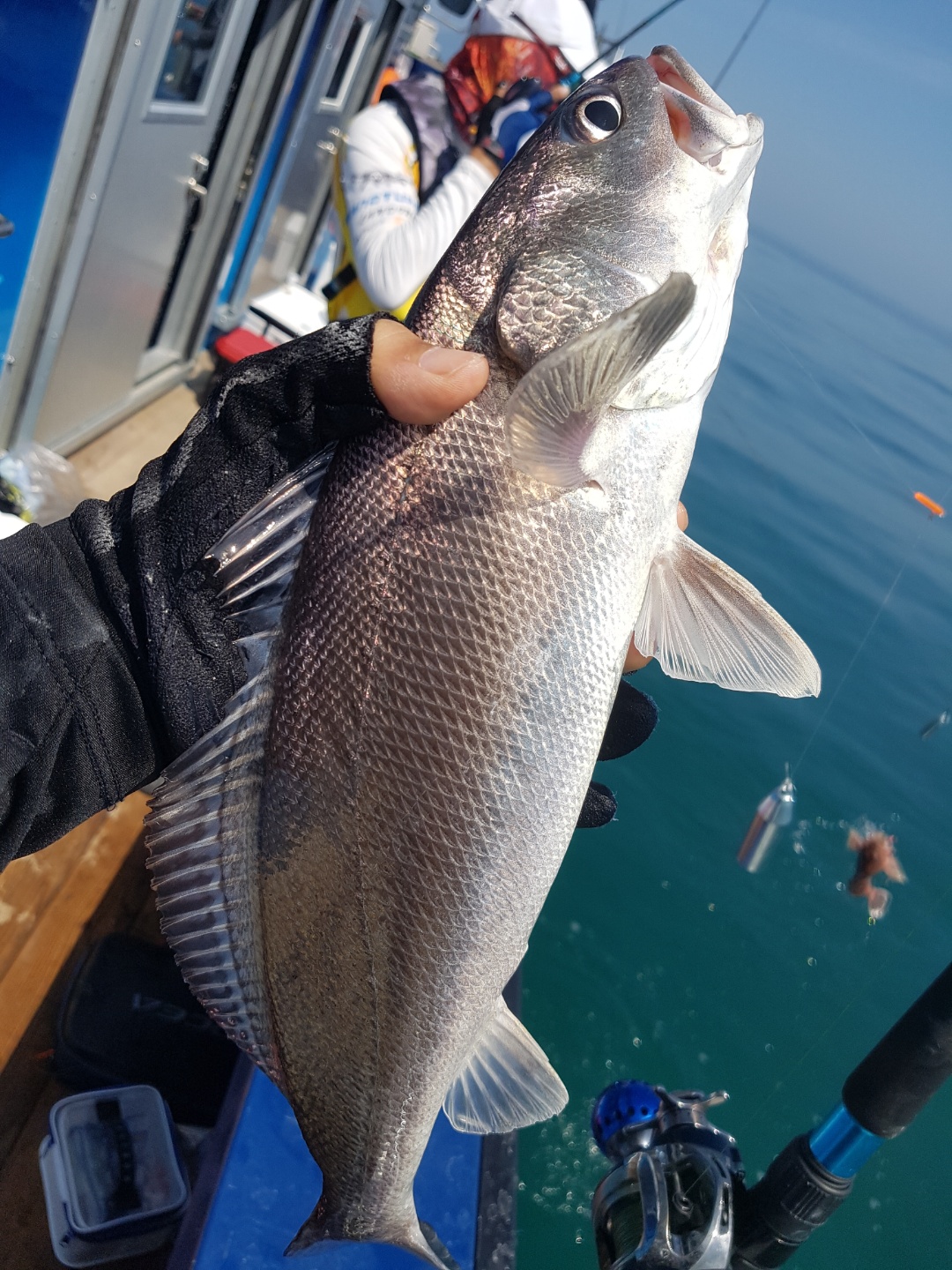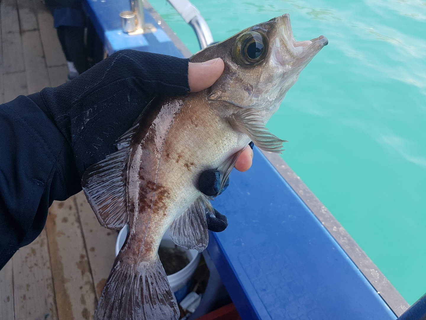 10분 정도 낚시를 하고 계속해서 포인트(물고기가 나오는 위치)를 욺겼다. 생새우 미끼를 바늘에 달고 낚시줄을 바닥까지 내리고 있는데 갑자기 낚시대가 휘었다. 붉바리였다. 처음엔 바다 바닥의 바위나 어초에 걸린 줄 알았다. 알고보니 붉바리 특유의 움직임이었다. 낚시줄이 바닥에 걸린 것처럼 엄청나게 묵직한 느낌을 줄 정도로 힘이 좋았다. 오전에 잡은 이 녀석은 한뼘 정도로 매우 작은 녀석이었다.