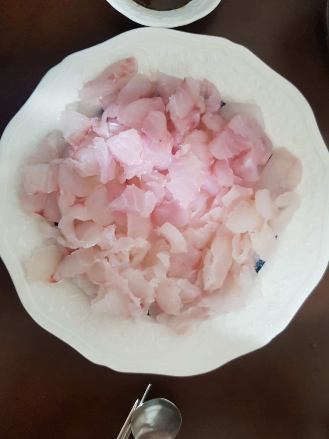 분홍색으로 보이는 게 민어회이고 흰색을 띄고 있는 횟감이 붉바리회다. 붉바리회가 다금바리보다 우위라는 말이 사실이었다. 쫀득쫀득, 쫄깃쫄깃하면서도 단 맛이 났다. 여태 먹어보지 못했던 생선회였다. 민어는 살이 물컹물컹하며 담백한 맛이 났다. 어디가서 꿀리지 않은 맛이지만 붉바리회 앞에서는 쭈글이가 돼버리고 말았다.