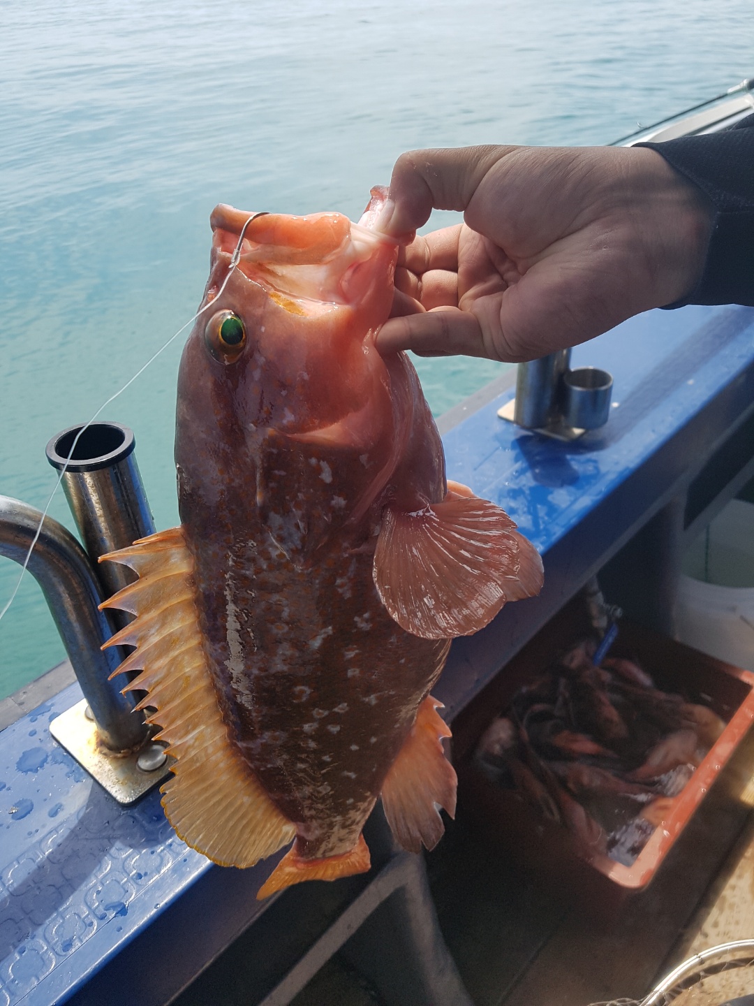 10분 정도 낚시를 하고 계속해서 포인트(물고기가 나오는 위치)를 욺겼다. 생새우 미끼를 바늘에 달고 낚시줄을 바닥까지 내리고 있는데 갑자기 낚시대가 휘었다. 붉바리였다. 처음엔 바다 바닥의 바위나 어초에 걸린 줄 알았다. 알고보니 붉바리 특유의 움직임이었다. 낚시줄이 바닥에 걸린 것처럼 엄청나게 묵직한 느낌을 줄 정도로 힘이 좋았다. 오전에 잡은 이 녀석은 한뼘 정도로 매우 작은 녀석이었다.
