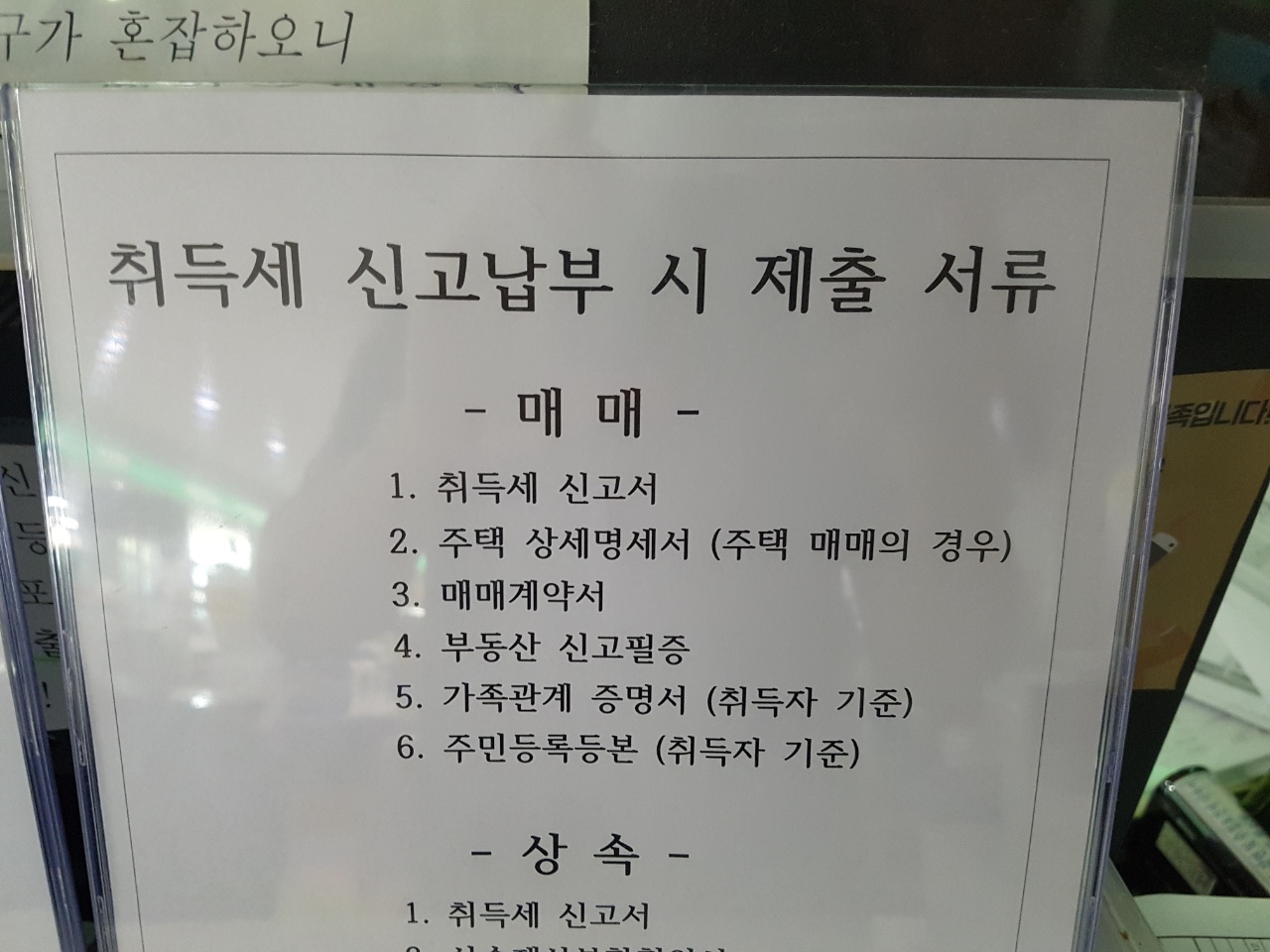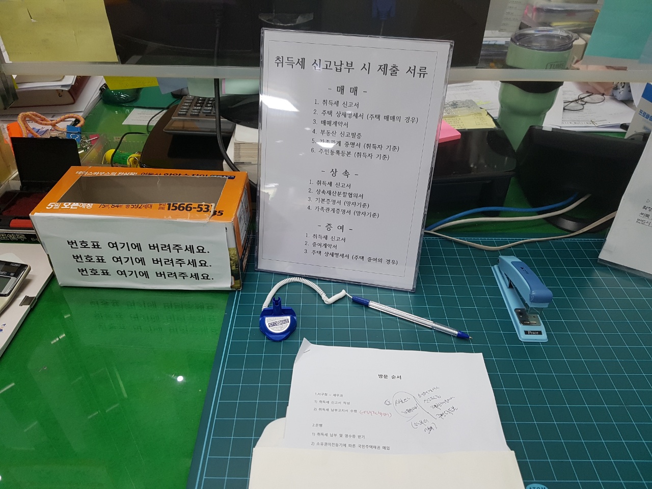 셀프등기날 가장 먼저 들리는 곳은 관할구청이다. 민원실에 방문해 취득세 신고서와 주택취득상세명세서를 작성 후 제출해야 한다. 나는 12시 20분 정도에 도착해 점심시간이 끝나는 1시까지 기다려야 했다. 물론 문서를 작성하는 시간이 있기 때문에 40분이라는 시간을 모두 낭비하지는 않았지만 20분 정도면 충분하기 때문에 점심시간대에 방문하려거든 12시 40분에 민원실에 도착하는 게 시간을 아끼는 방법이다.