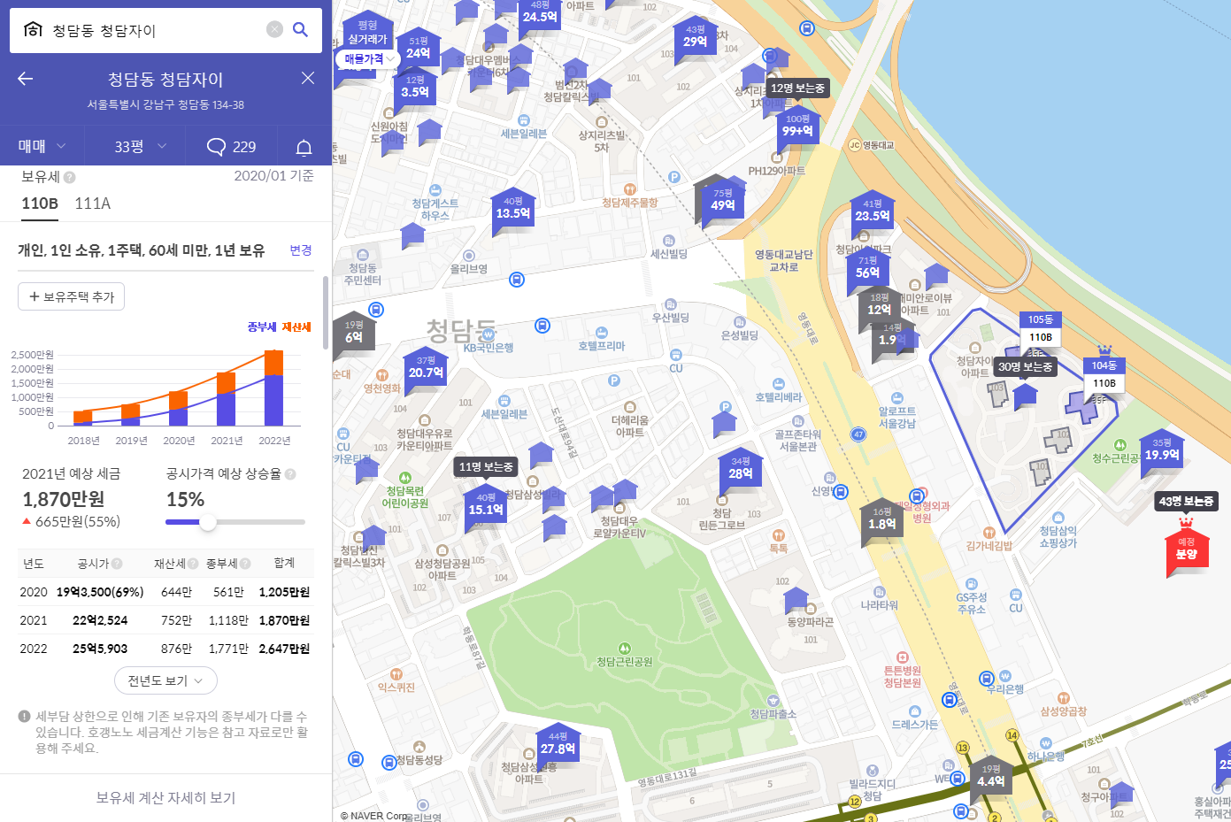 화면 왼쪽 아래로 내려오면 보유세까지 확인할 수 있다. 2021년 보유세만 1,870만원이라니! 중산층은 꿈도 못 꾸는 부자들의 아파트라고 봐도 되겠다. :)