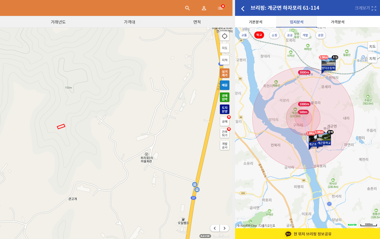 오른쪽 화면이 바뀌면서 토지를 분석하는 기능이 보여진다. 크게 기본분석, 입지분석, 가격분석으로 나뉘는데 입지분석에 들어가보면 교통, 학교, 쇼핑, 공공, 개발, 공원까지 해당 토지의 입지를 한눈에 확인할 수 있다. 학교를 눌러놨더니 해당 토지의 약 2km 위치에 초등학교와 중학교가 있었다. 유치한 이름과는 달리 토지 입지 분석에 톡톡히 도움이 되는 유용한 부동산 사이트라고 할 수 있겠다. :)